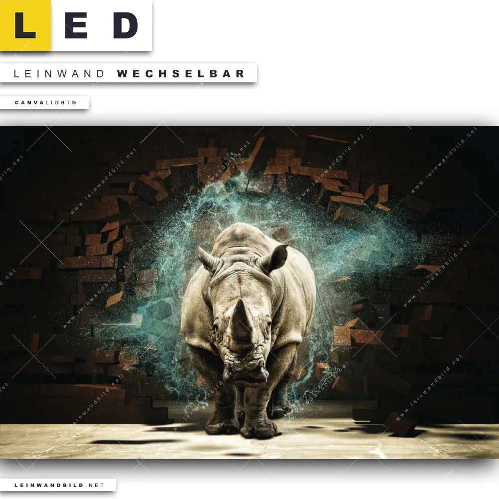 LED Leinwandbild Canvalight® TEX | Nashorn zerstört Wand | Querformat