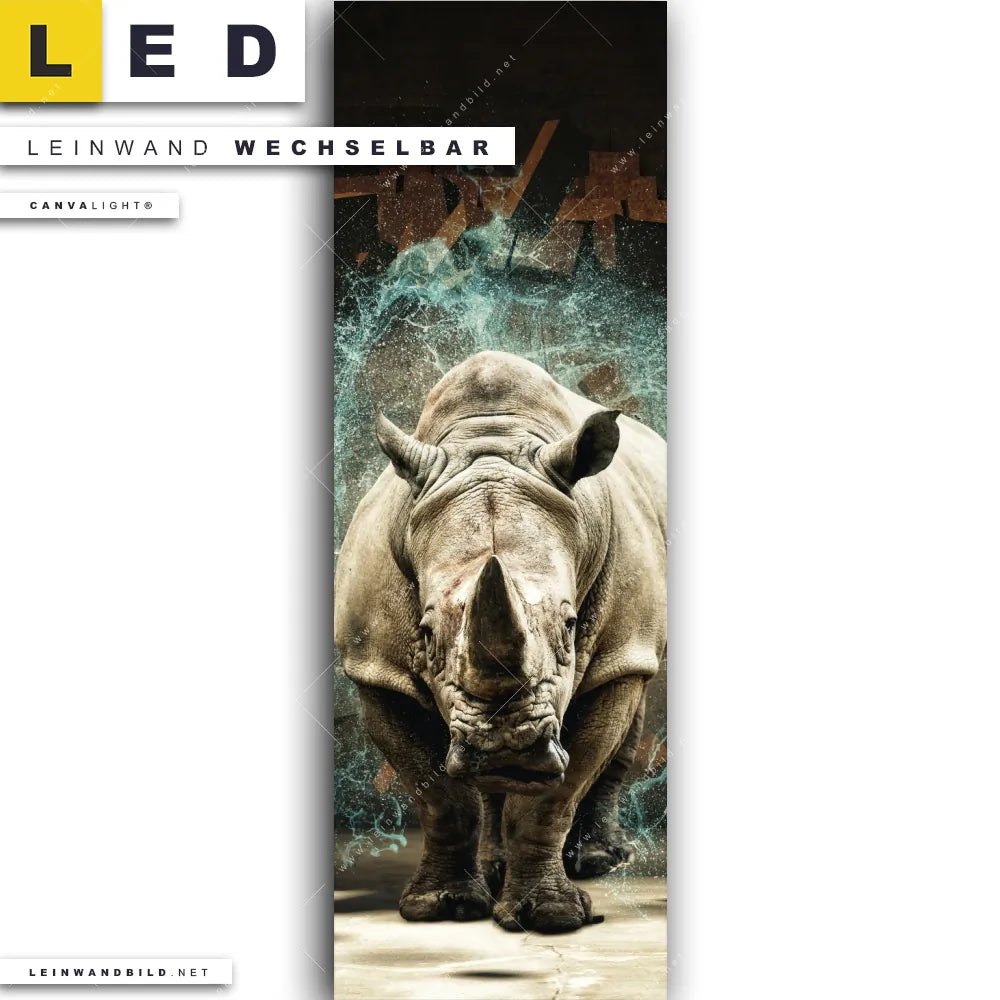 LED Leinwandbild Canvalight® TEX | Nashorn zerstört Wand | Schmal