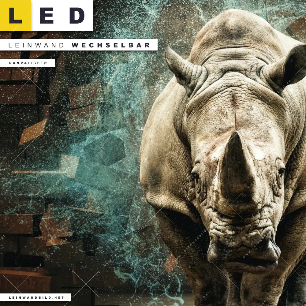 Du bist auf der Suche nach einem Tierwelt LED Leinwandbild im Schmalen Format? Begriffe wie Nashorn, Afrika, wild, Safari, Mauer, Durchbruch, Zerstörung haben Dich auf der Suche nach Deinem neuen XXL LED Wandbild mit wechselbarer Leinwand inspiriert? Farben wie Beige, Türkis, Schwarz dürfen auf Deinem neuen Leinwand-LED-Bild im Panorama-Hochformat nicht fehlen und Leuchtbilder im Modern Art, Mixed Media Stil passen perfekt zu Deinem Einrichtungsstil?