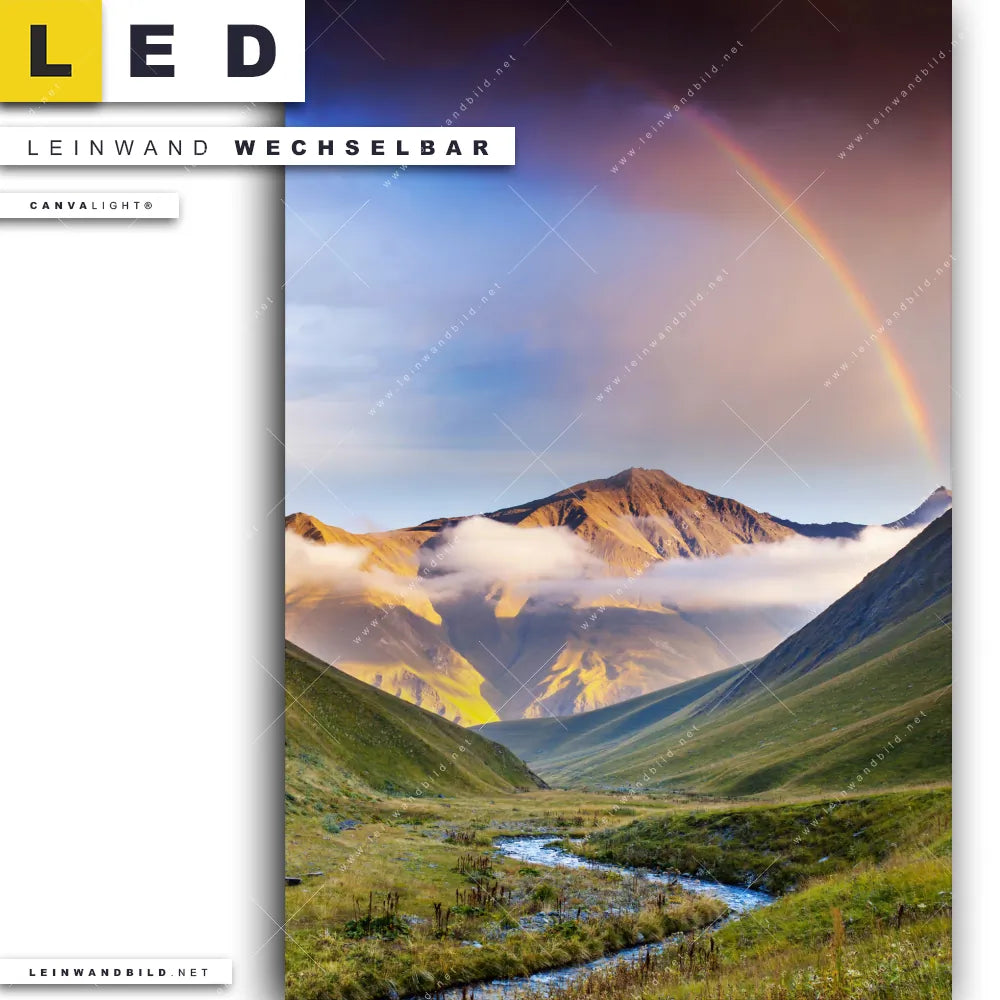Du konfigurierst Dein individuelles LED Leinwandbild Canvalight® TEX | Nebel und Regenbogen zwischen den Bergen | Hochformat und wir produzieren es NEU für Dich. Unsere Landschaften LED Bilder mit wechselbarer Textil-Leinwand sind KEINE Lagerware. Du bist Dir unsicher, welches Motiv oder Format das richtige für dein individuelles Canvalight® Leuchtbild ist, dann helfen wir dir gerne weiter und beraten dich!