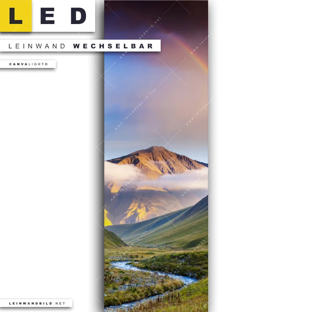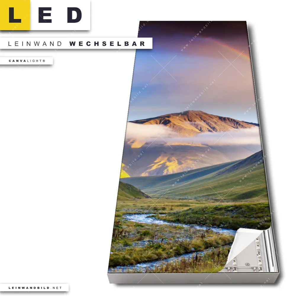 Du konfigurierst Dein individuelles LED Leinwandbild Canvalight® TEX | Nebel und Regenbogen zwischen den Bergen | Schmal und wir produzieren es NEU für Dich. Unsere Landschaften LED Bilder mit wechselbarer Textil-Leinwand sind KEINE Lagerware. Du bist Dir unsicher, welches Motiv oder Format das richtige für dein individuelles Canvalight® Leuchtbild ist, dann helfen wir dir gerne weiter und beraten dich!