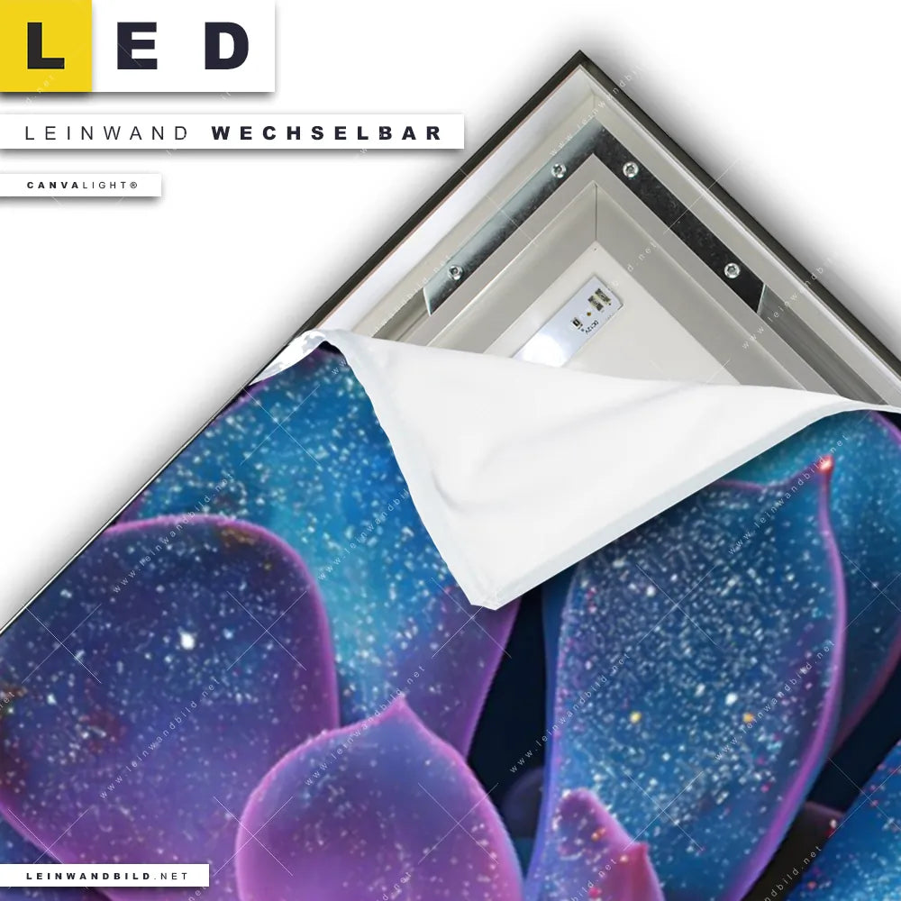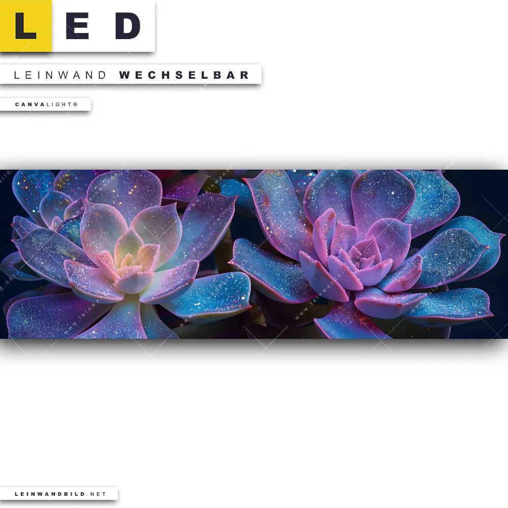 Du bist auf der Suche nach einem Blumen - Botanik LED Leinwandbild im Panorama-Format? Begriffe wie Blumen, Sukkulente, Kaktus, Pflanze, Natur, Blüten, Glitzer haben Dich auf der Suche nach Deinem neuen XXL LED Wandbild mit wechselbarer Leinwand inspiriert? Farben wie Lila, Schwarz, Blau dürfen auf Deinem neuen extra breiten Leinwand-LED-Bild nicht fehlen und Leuchtbilder im Floral, Modern Art Stil passen perfekt zu Deinem Einrichtungsstil?