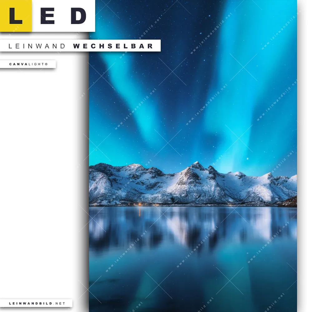 LED Leinwandbild Canvalight® TEX | Nordlichter und schneebedeckte Berge | Hochformat