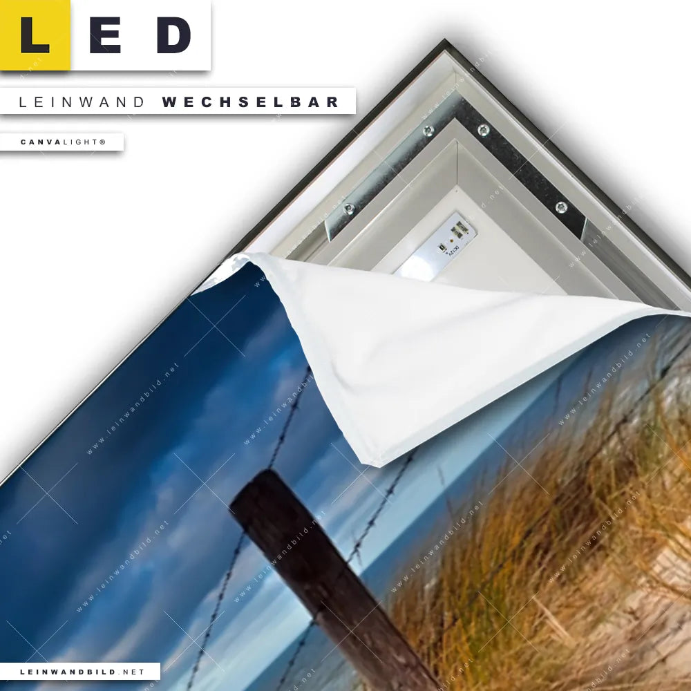 Du konfigurierst Dein individuelles LED Leinwandbild Canvalight® TEX | Nordseeküste & Wolken | Panorama und wir produzieren es NEU für Dich. Unsere Landschaften, Strand - Meer LED Bilder mit wechselbarer Textil-Leinwand sind KEINE Lagerware. Du bist Dir unsicher, welches Motiv oder Format das richtige für dein individuelles Canvalight® Leuchtbild ist, dann helfen wir dir gerne weiter und beraten dich!