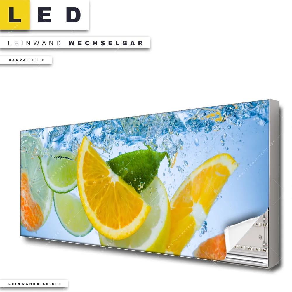 Du bist auf der Suche nach einem Essen - Trinken LED Leinwandbild im Panorama-Format? Begriffe wie Obst, Zitrusfrüchte, Früchte, frisch, spritzig, Spritzwasser, Wasser, Spritzer, Tropfen, Wassertropfen, Orange, Zitrone, Limette haben Dich auf der Suche nach Deinem neuen XXL LED Wandbild mit wechselbarer Leinwand inspiriert? Farben wie Blau, Orange, Gelb , Grün dürfen auf Deinem neuen extra breiten Leinwand-LED-Bild nicht fehlen und Leuchtbilder im Mixed Media, Modern Art Stil passen perfekt zu Deinem Einrichtungsstil?