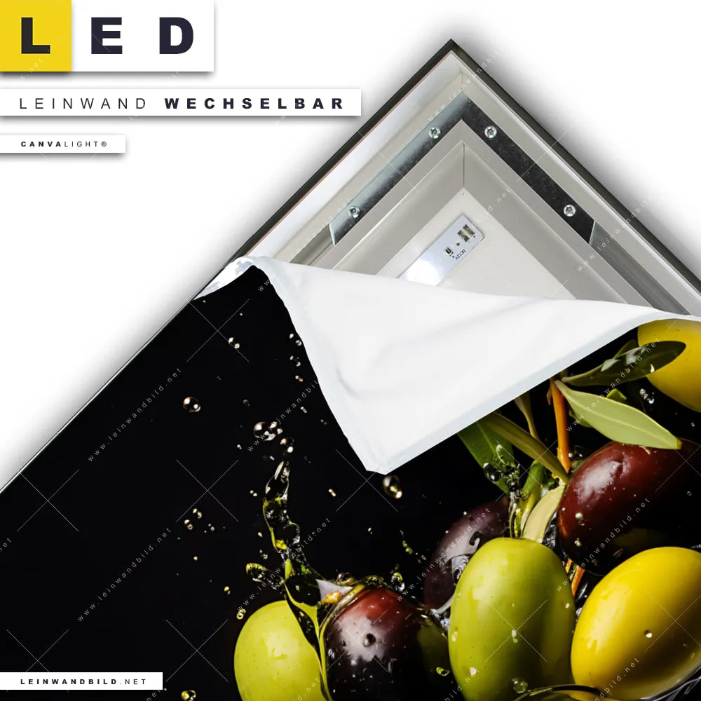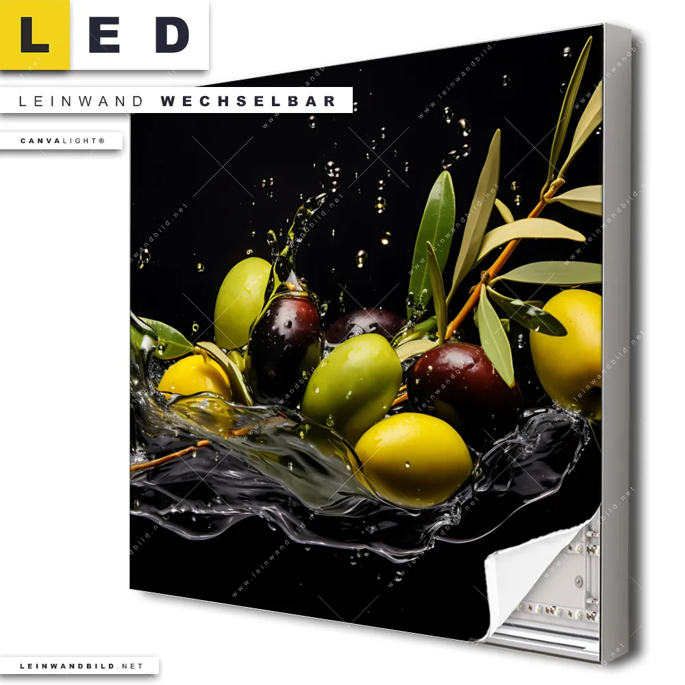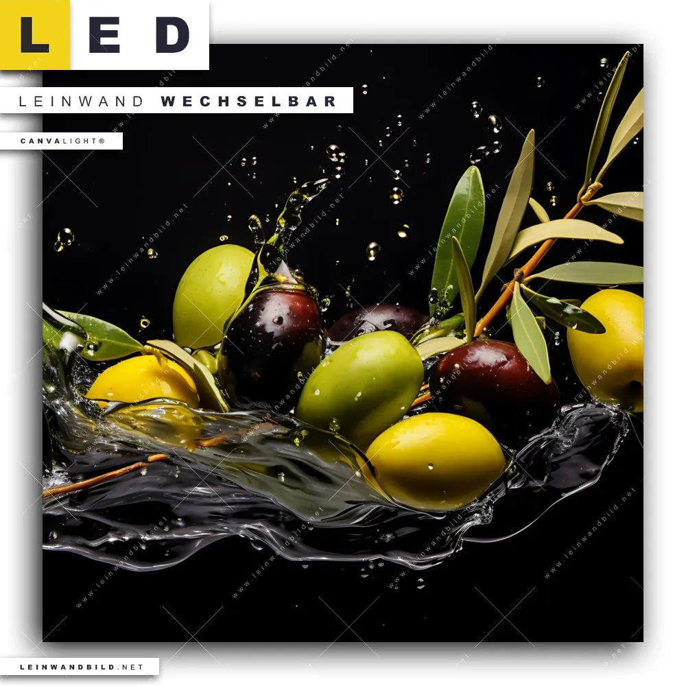 Du bist auf der Suche nach einem Essen - Trinken LED Leinwandbild im Quadratischen Format? Begriffe wie Wassersplash, Oliven, Küche, Lebensmittel, Essen, Gemüse haben Dich auf der Suche nach Deinem neuen XXL LED Wandbild mit wechselbarer Leinwand inspiriert? Farben wie Schwarz, Grün, Braun dürfen auf Deinem neuen Leinwand-LED-Bild nicht fehlen und Leuchtbilder im Natürlich - Realistisch, Modern Art Stil passen perfekt zu Deinem Einrichtungsstil?