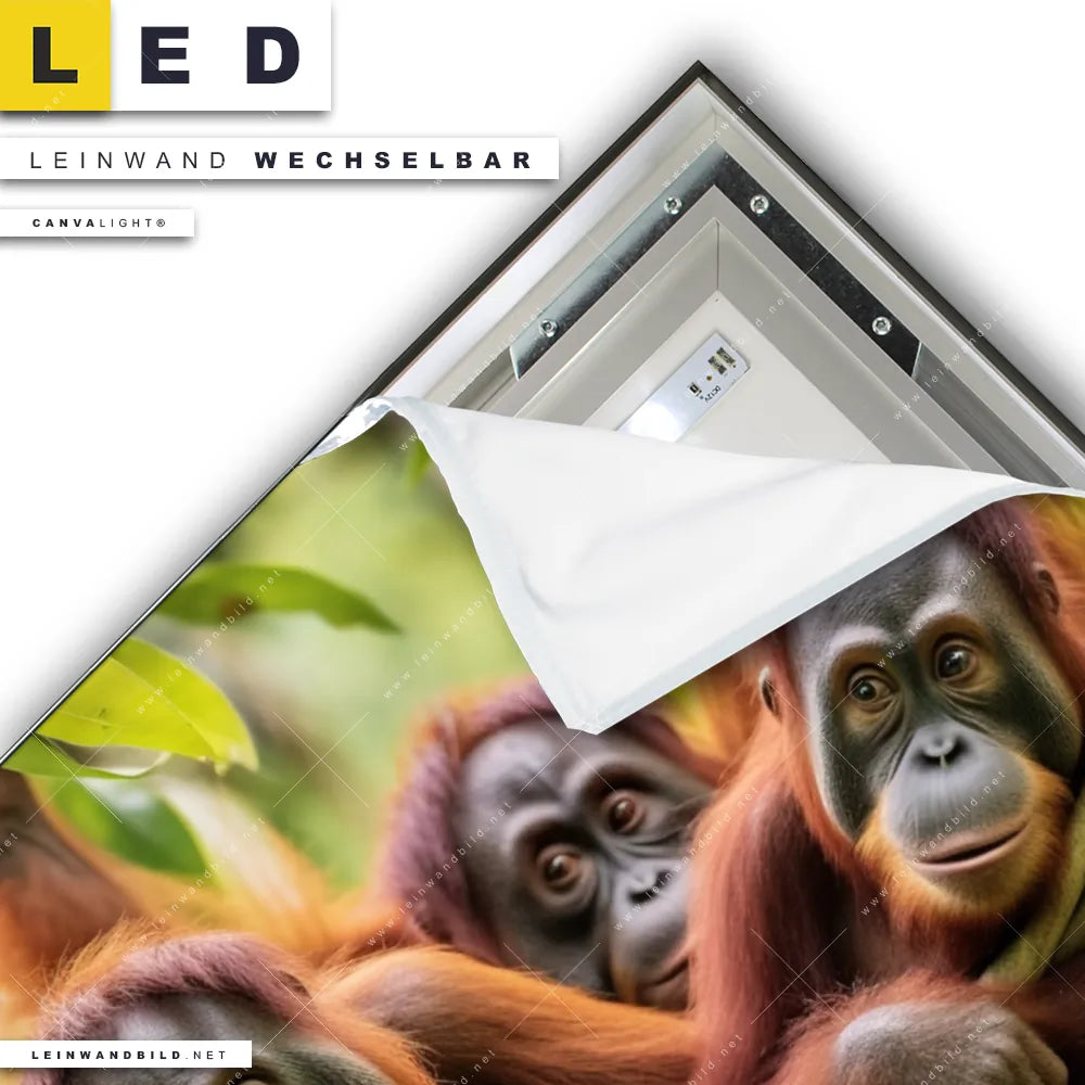 Du konfigurierst Dein individuelles LED Leinwandbild Canvalight® TEX | Orang Utan Familie im Regenwald | Querformat und wir produzieren es NEU für Dich. Unsere Tierwelt LED Bilder mit wechselbarer Textil-Leinwand sind KEINE Lagerware. Du bist Dir unsicher, welches Motiv oder Format das richtige für dein individuelles Canvalight® Leuchtbild ist, dann helfen wir dir gerne weiter und beraten dich!