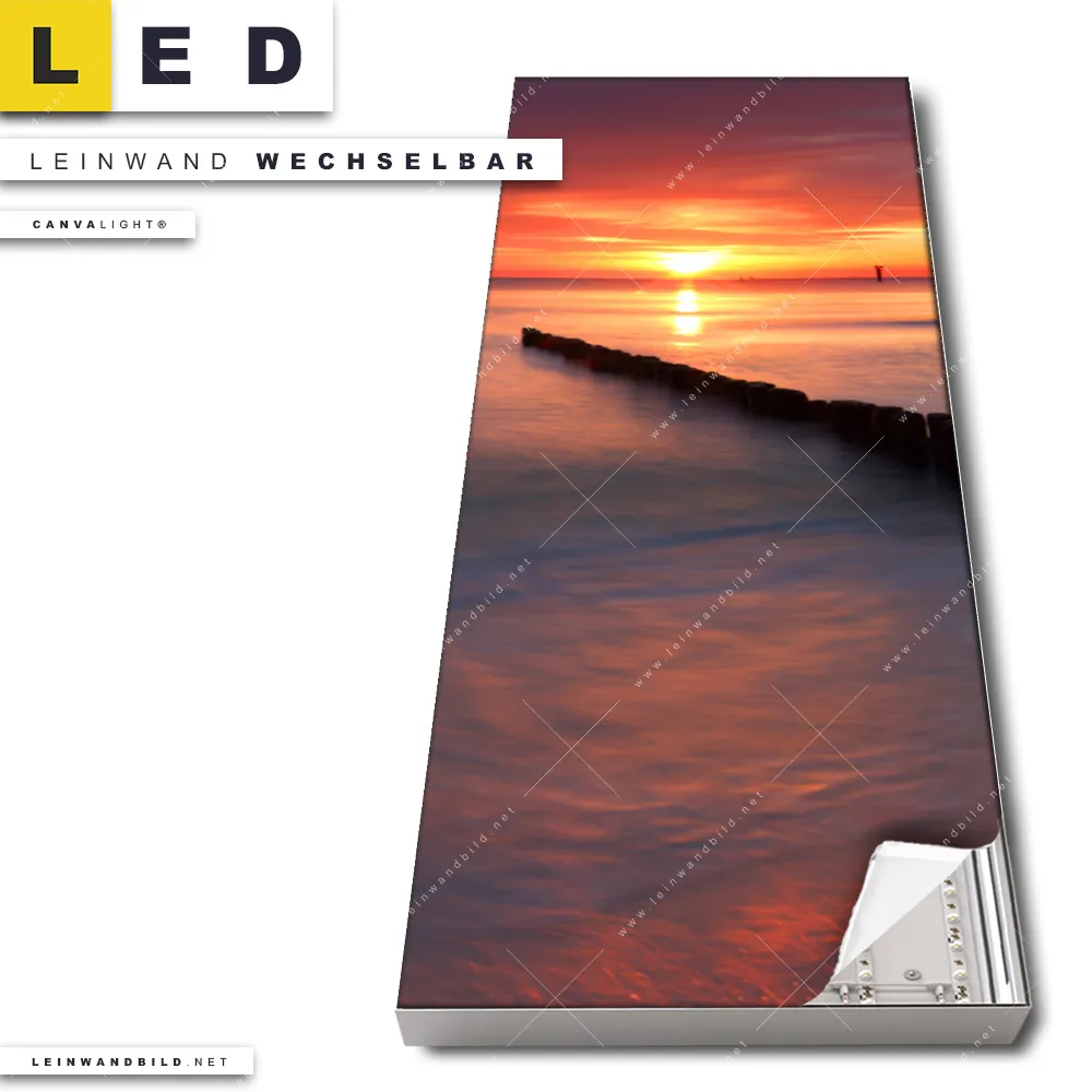 Du konfigurierst Dein individuelles LED Leinwandbild Canvalight® TEX | Ostsee Sonnenuntergang | Schmal und wir produzieren es NEU für Dich. Unsere Strand - Meer, Landschaften LED Bilder mit wechselbarer Textil-Leinwand sind KEINE Lagerware. Du bist Dir unsicher, welches Motiv oder Format das richtige für dein individuelles Canvalight® Leuchtbild ist, dann helfen wir dir gerne weiter und beraten dich!