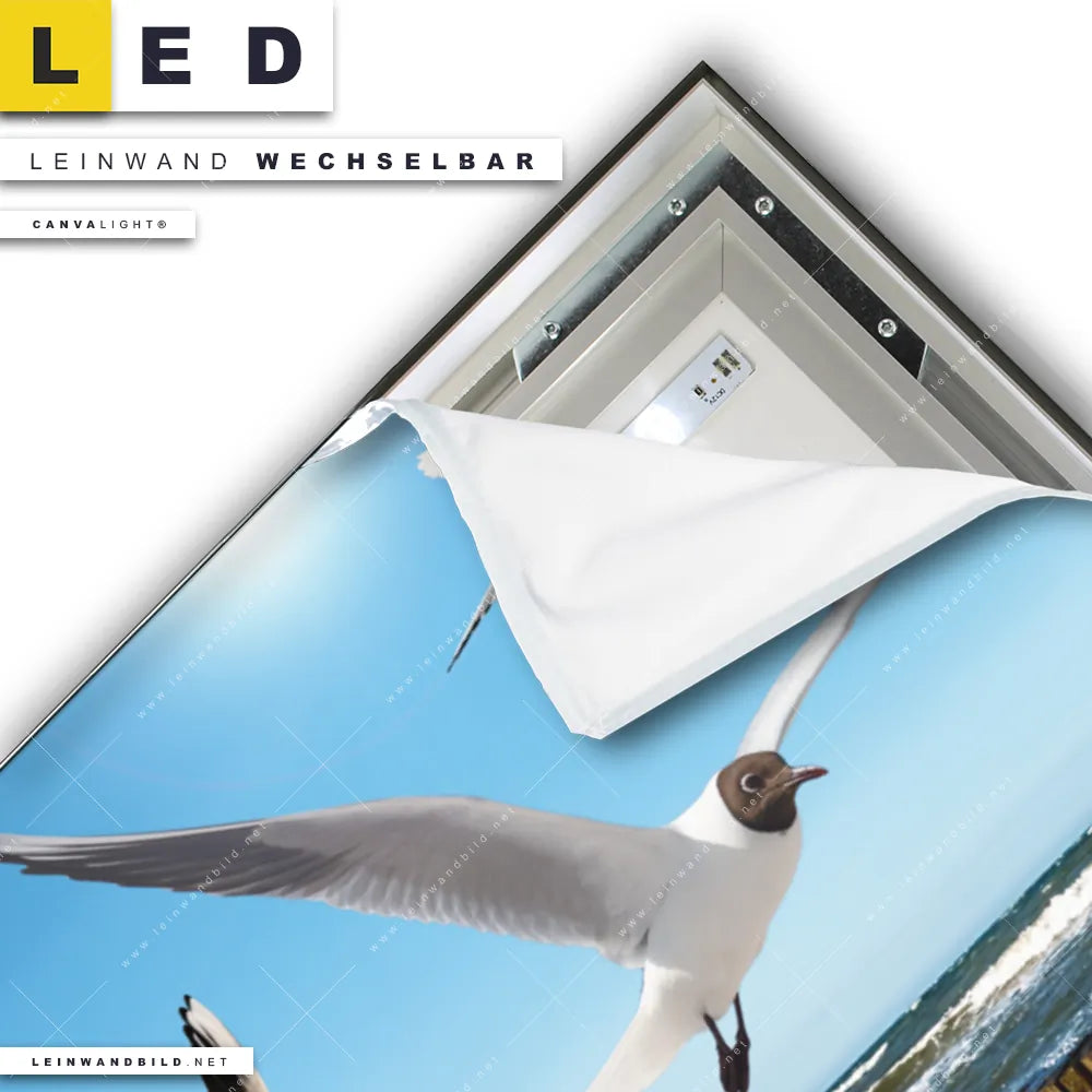 Du konfigurierst Dein individuelles LED Leinwandbild Canvalight® TEX | Ostseeküste & Möwen | Hochformat und wir produzieren es NEU für Dich. Unsere Strand - Meer, Landschaften LED Bilder mit wechselbarer Textil-Leinwand sind KEINE Lagerware. Du bist Dir unsicher, welches Motiv oder Format das richtige für dein individuelles Canvalight® Leuchtbild ist, dann helfen wir dir gerne weiter und beraten dich!