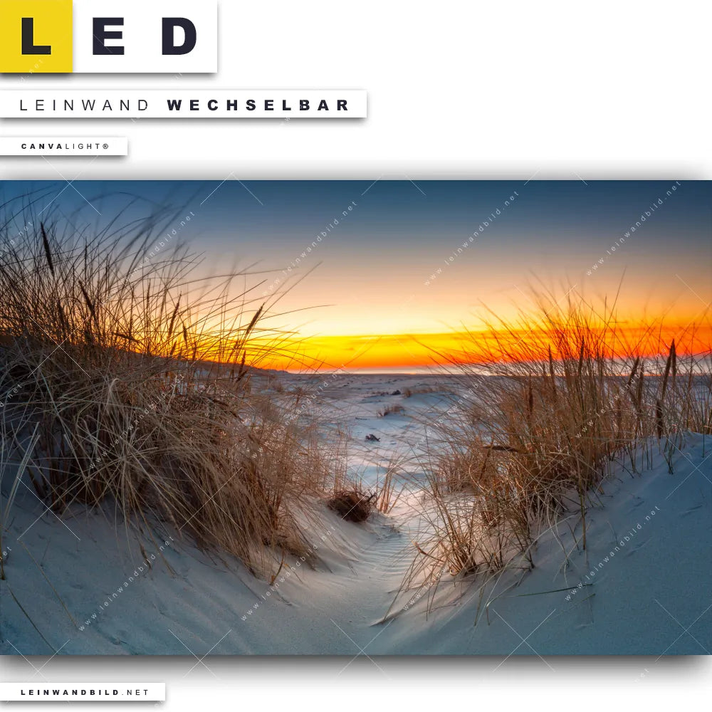 Du bist auf der Suche nach einem Landschaften, Strand - Meer LED Leinwandbild im Querformat? Begriffe wie Deutschland, Herbst, Sommer, Urlaub - Reisen, Ostsee - Nordsee, Sonnenuntergang - Sonnenaufgang, Frühling, Sand, Dünen, Gräser haben Dich auf der Suche nach Deinem neuen XXL LED Wandbild mit wechselbarer Leinwand inspiriert? Farben wie Beige, Orange, Blau dürfen auf Deinem neuen breiten Leinwand-LED-Bild nicht fehlen und Leuchtbilder im Natürlich - Realistisch Stil passen perfekt zu Deinem Einrichtungsstil?