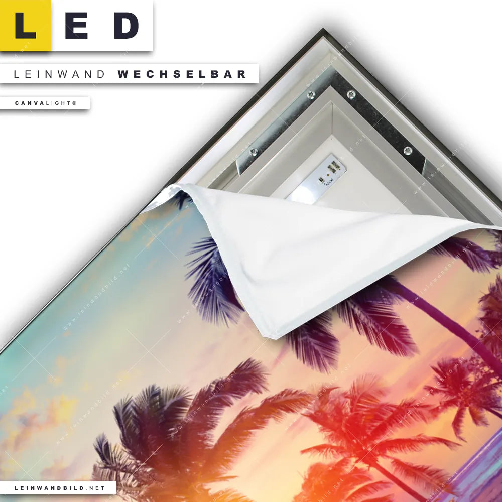 Du konfigurierst Dein individuelles LED Leinwandbild Canvalight® TEX | Palmen bei Sonnenuntergang | Querformat und wir produzieren es NEU für Dich. Unsere Landschaften, Strand - Meer LED Bilder mit wechselbarer Textil-Leinwand sind KEINE Lagerware. Du bist Dir unsicher, welches Motiv oder Format das richtige für dein individuelles Canvalight® Leuchtbild ist, dann helfen wir dir gerne weiter und beraten dich!