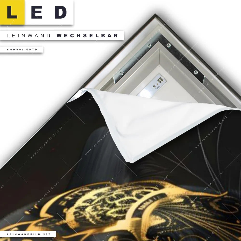 Du konfigurierst Dein individuelles LED Leinwandbild Canvalight® TEX | Panther mit goldenen Ornamenten | Schmal und wir produzieren es NEU für Dich. Unsere Tierwelt LED Bilder mit wechselbarer Textil-Leinwand sind KEINE Lagerware. Du bist Dir unsicher, welches Motiv oder Format das richtige für dein individuelles Canvalight® Leuchtbild ist, dann helfen wir dir gerne weiter und beraten dich!