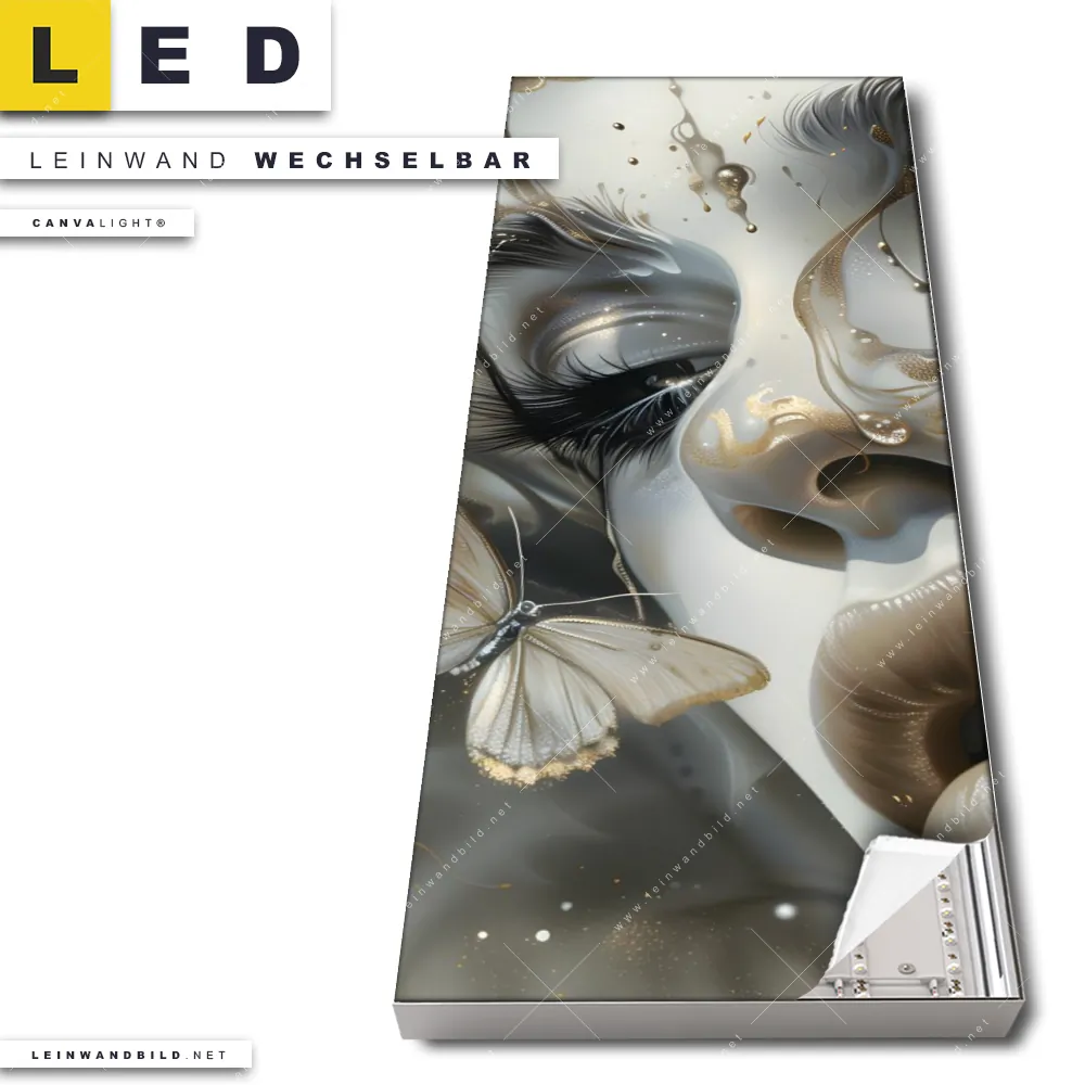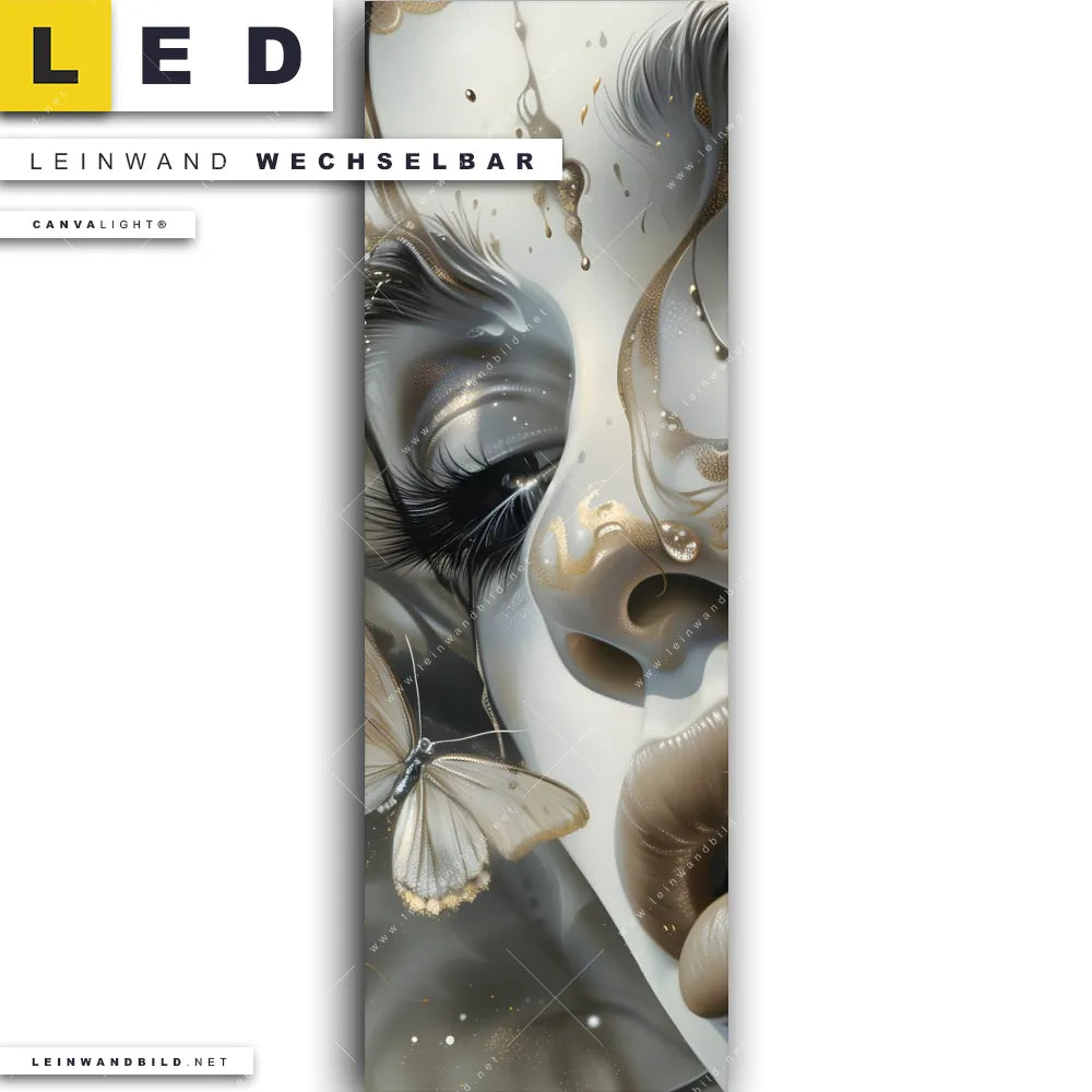 Du bist auf der Suche nach einem Porträts - Menschen LED Leinwandbild im Schmalen Format? Begriffe wie Porträt, Gesicht, Frau, Schmetterlinge, Frauenporträt, Fluid Art, Farbspritzer haben Dich auf der Suche nach Deinem neuen XXL LED Wandbild mit wechselbarer Leinwand inspiriert? Farben wie Gold, Grau , Schwarz, Beige dürfen auf Deinem neuen Leinwand-LED-Bild im Panorama-Hochformat nicht fehlen und Leuchtbilder im Modern Art, Abstrakt Stil passen perfekt zu Deinem Einrichtungsstil?