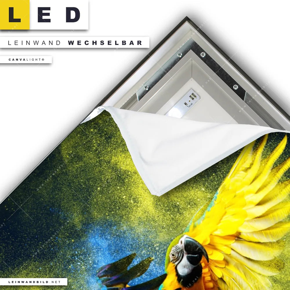 Du konfigurierst Dein individuelles LED Leinwandbild Canvalight® TEX | Papagei - Farbexplosion | Hochformat und wir produzieren es NEU für Dich. Unsere Tierwelt LED Bilder mit wechselbarer Textil-Leinwand sind KEINE Lagerware. Du bist Dir unsicher, welches Motiv oder Format das richtige für dein individuelles Canvalight® Leuchtbild ist, dann helfen wir dir gerne weiter und beraten dich!