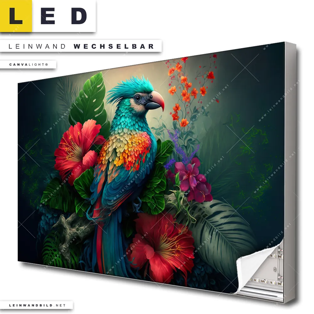 Du bist auf der Suche nach einem Tierwelt, Blumen - Botanik LED Leinwandbild im Querformat? Begriffe wie Vogel, Papagei, Dschungel, Farbe, bunt, Blätter, Blüten, Blumen haben Dich auf der Suche nach Deinem neuen XXL LED Wandbild mit wechselbarer Leinwand inspiriert? Farben wie Blau, Grün, Rot dürfen auf Deinem neuen breiten Leinwand-LED-Bild nicht fehlen und Leuchtbilder im Floral, Modern Art Stil passen perfekt zu Deinem Einrichtungsstil?