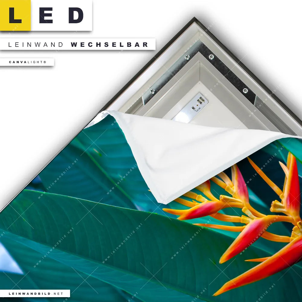 Du konfigurierst Dein individuelles LED Leinwandbild Canvalight® TEX | Paradiesvogelblume | Quadrat und wir produzieren es NEU für Dich. Unsere Blumen - Botanik LED Bilder mit wechselbarer Textil-Leinwand sind KEINE Lagerware. Du bist Dir unsicher, welches Motiv oder Format das richtige für dein individuelles Canvalight® Leuchtbild ist, dann helfen wir dir gerne weiter und beraten dich!