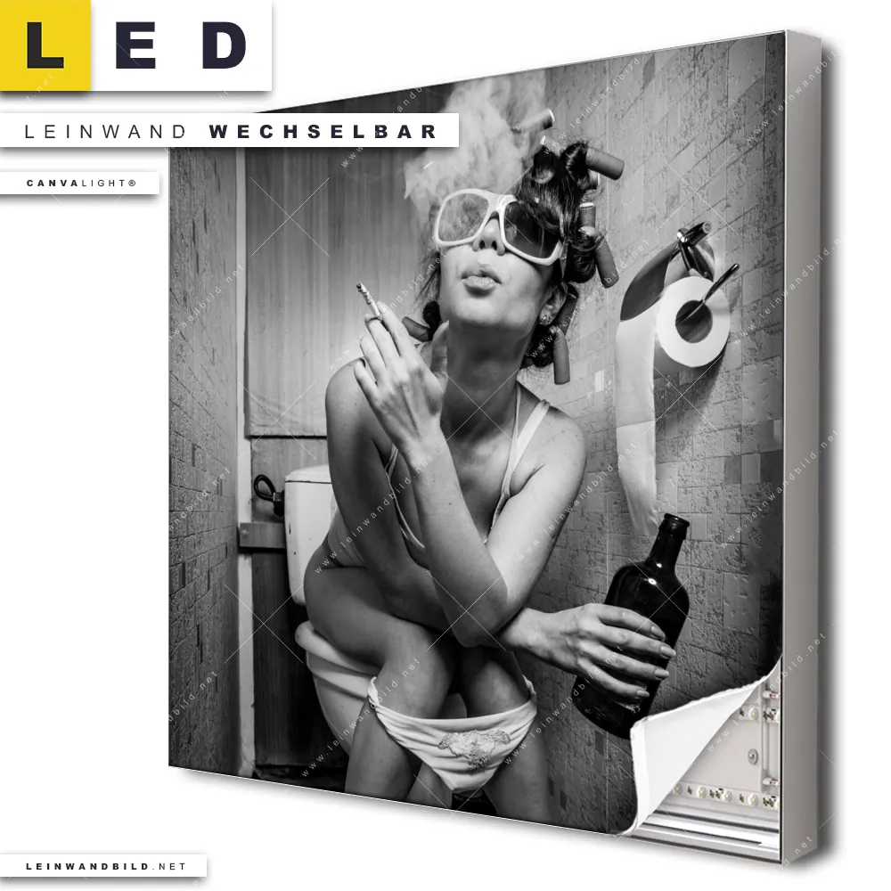 Du bist auf der Suche nach einem Porträts - Menschen LED Leinwandbild im Quadratischen Format? Begriffe wie Frau, Erotik, modern, sexy, Alkohol, Zigarette, rauchen, Toilette, WC, Party, Sonnenbrille haben Dich auf der Suche nach Deinem neuen XXL LED Wandbild mit wechselbarer Leinwand inspiriert? Farben wie Weiss, Schwarz, Grau dürfen auf Deinem neuen Leinwand-LED-Bild nicht fehlen und Leuchtbilder im Modern Art, Schwarz - Weiss Stil passen perfekt zu Deinem Einrichtungsstil?