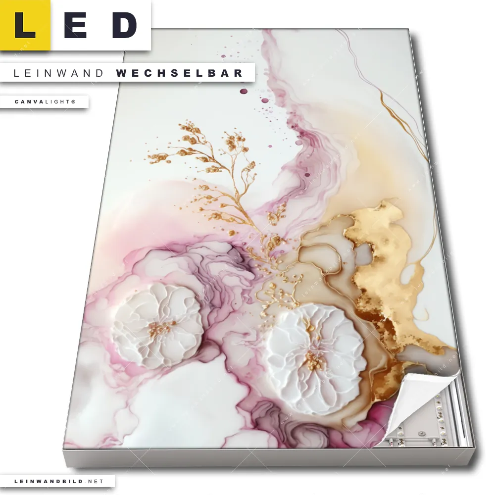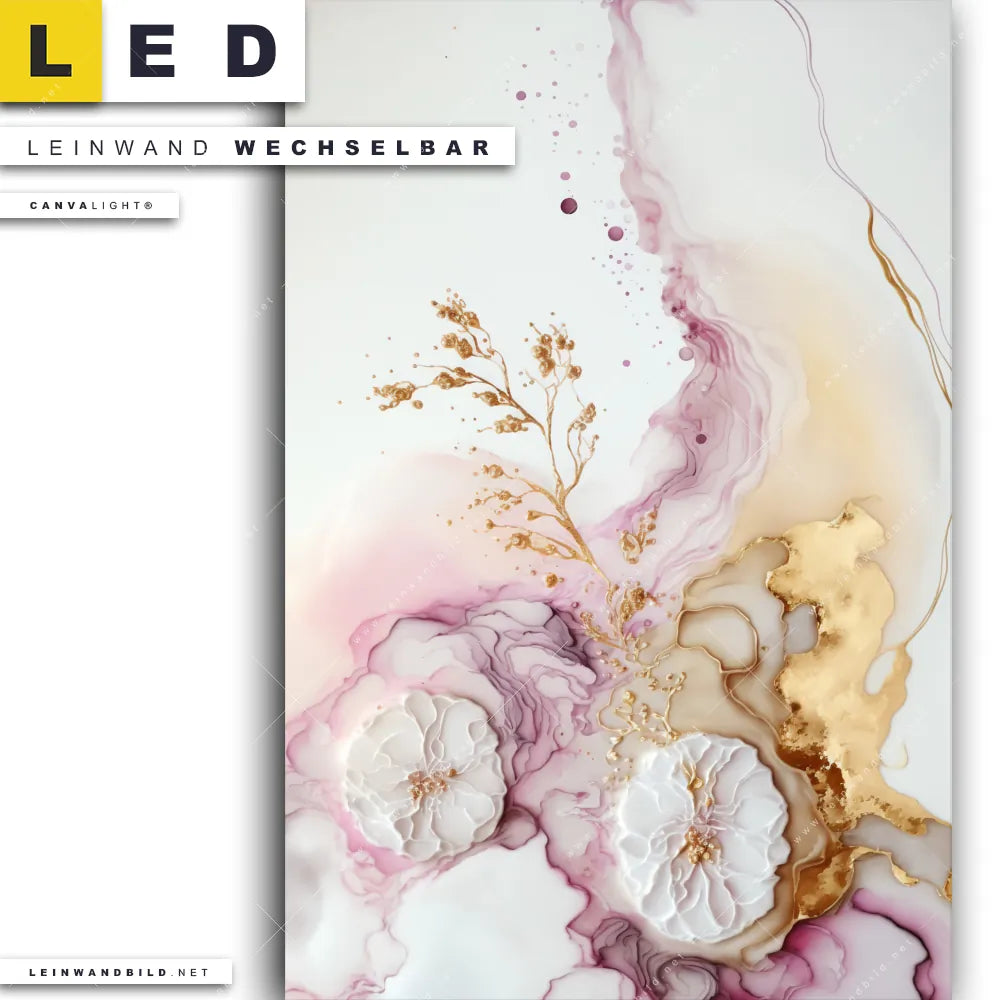 Du bist auf der Suche nach einem Blumen - Botanik, Muster - Texturen LED Leinwandbild im Hochformat? Begriffe wie Blume, Pastell, Kunst, Hintergrund, Marmorierung, Acryl, Blüte, Alkoholtinte haben Dich auf der Suche nach Deinem neuen XXL LED Wandbild mit wechselbarer Leinwand inspiriert? Farben wie Weiss, Gold, Orange, Rosa dürfen auf Deinem neuen Leinwand-LED-Bild nicht fehlen und Leuchtbilder im Abstrakt, Modern Art, Floral Stil passen perfekt zu Deinem Einrichtungsstil?