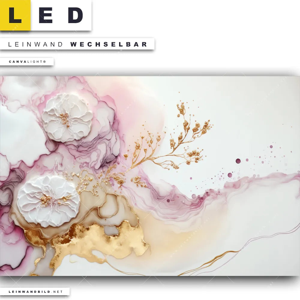 Du bist auf der Suche nach einem Blumen - Botanik, Muster - Texturen LED Leinwandbild im Querformat? Begriffe wie Blume, Pastell, Kunst, Hintergrund, Marmorierung, Acryl, Blüte, Alkoholtinte haben Dich auf der Suche nach Deinem neuen XXL LED Wandbild mit wechselbarer Leinwand inspiriert? Farben wie Weiss, Gold, Orange, Rosa dürfen auf Deinem neuen breiten Leinwand-LED-Bild nicht fehlen und Leuchtbilder im Abstrakt, Modern Art, Floral Stil passen perfekt zu Deinem Einrichtungsstil?