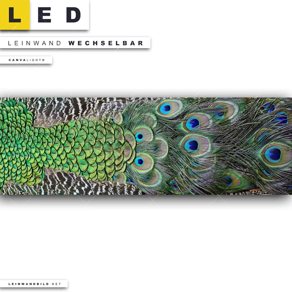 Du bist auf der Suche nach einem Tierwelt, Muster - Texturen LED Leinwandbild im Panorama-Format? Begriffe wie Vogel, Pfau, Dschungel, Federn, Pfaufedern haben Dich auf der Suche nach Deinem neuen XXL LED Wandbild mit wechselbarer Leinwand inspiriert? Farben wie Grün, Blau dürfen auf Deinem neuen extra breiten Leinwand-LED-Bild nicht fehlen und Leuchtbilder im Natürlich - Realistisch Stil passen perfekt zu Deinem Einrichtungsstil?