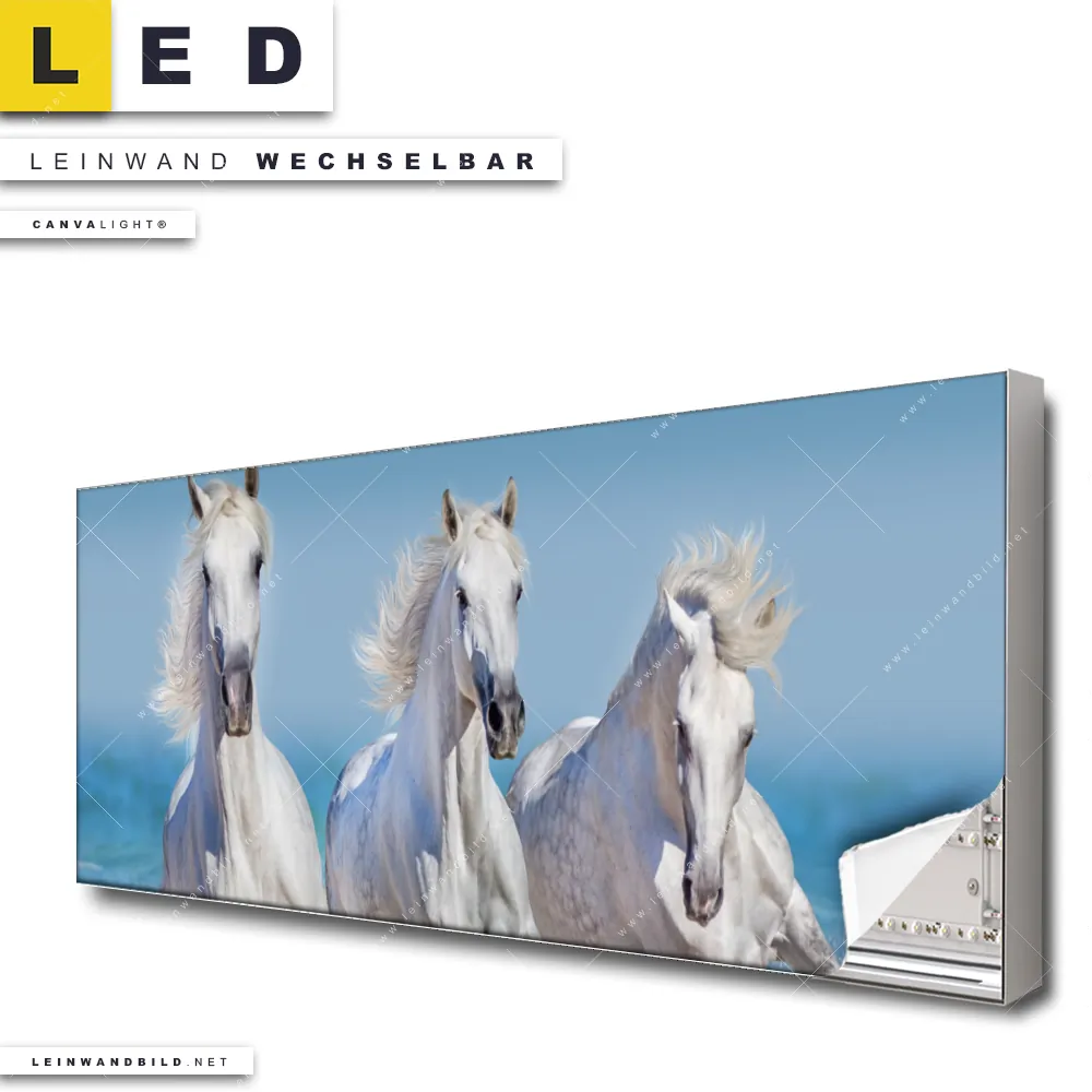 Du bist auf der Suche nach einem Tierwelt LED Leinwandbild im Panorama-Format? Begriffe wie Hengst, Stute, Pony, Meer, Strand, Pferde, Wellen haben Dich auf der Suche nach Deinem neuen XXL LED Wandbild mit wechselbarer Leinwand inspiriert? Farben wie Weiss, Blau dürfen auf Deinem neuen extra breiten Leinwand-LED-Bild nicht fehlen und Leuchtbilder im Natürlich - Realistisch Stil passen perfekt zu Deinem Einrichtungsstil?