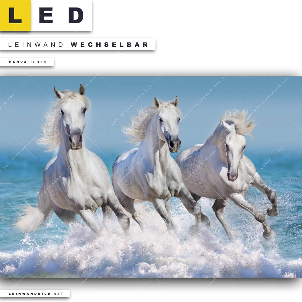 Du bist auf der Suche nach einem Tierwelt LED Leinwandbild im Querformat? Begriffe wie Hengst, Stute, Pony, Meer, Strand, Pferde, Wellen haben Dich auf der Suche nach Deinem neuen XXL LED Wandbild mit wechselbarer Leinwand inspiriert? Farben wie Weiss, Blau dürfen auf Deinem neuen breiten Leinwand-LED-Bild nicht fehlen und Leuchtbilder im Natürlich - Realistisch Stil passen perfekt zu Deinem Einrichtungsstil?