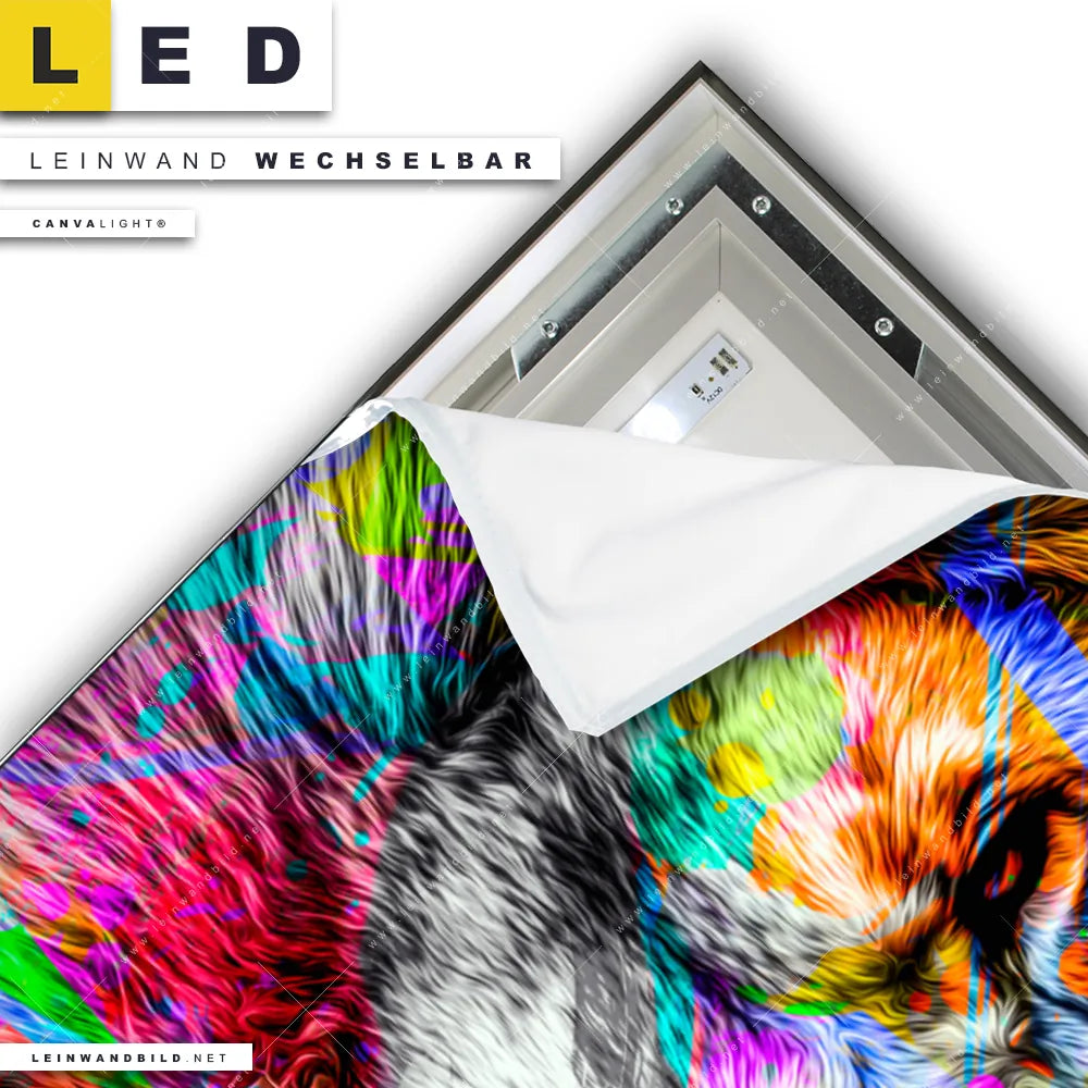Du konfigurierst Dein individuelles LED Leinwandbild Canvalight® TEX | Pop Art Löwe No.1 | Hochformat und wir produzieren es NEU für Dich. Unsere Tierwelt LED Bilder mit wechselbarer Textil-Leinwand sind KEINE Lagerware. Du bist Dir unsicher, welches Motiv oder Format das richtige für dein individuelles Canvalight® Leuchtbild ist, dann helfen wir dir gerne weiter und beraten dich!