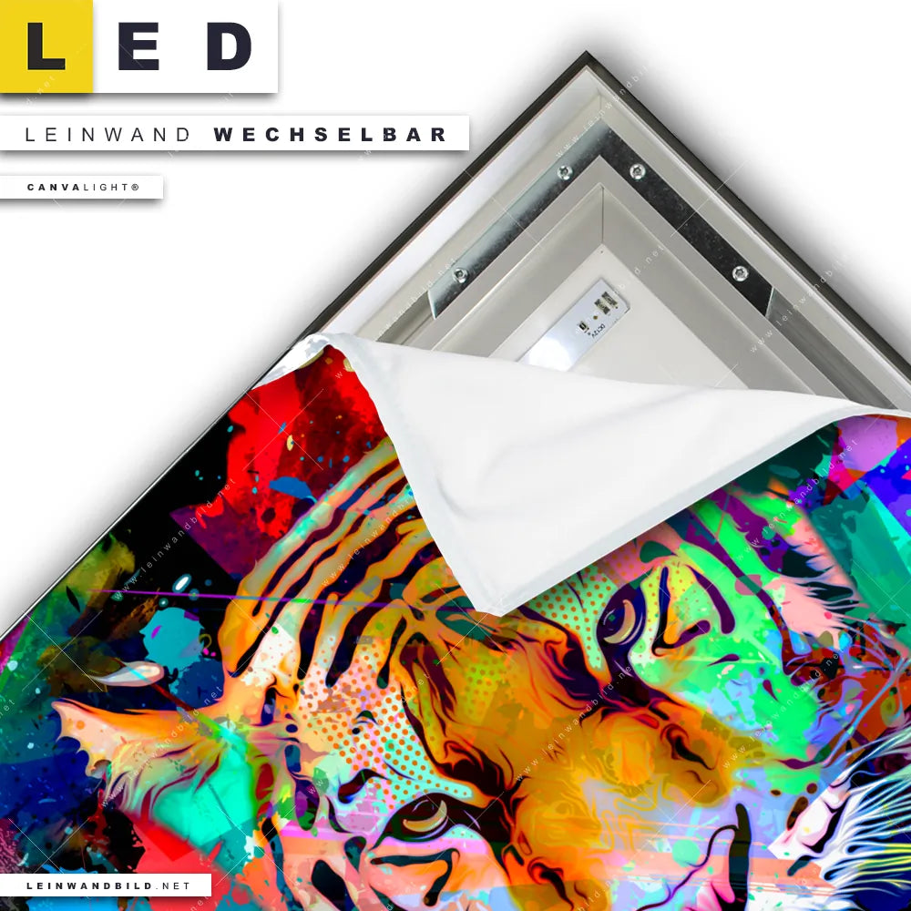 Du konfigurierst Dein individuelles LED Leinwandbild Canvalight® TEX | Pop Art Tiger No. 2 | Quadrat und wir produzieren es NEU für Dich. Unsere Tierwelt LED Bilder mit wechselbarer Textil-Leinwand sind KEINE Lagerware. Du bist Dir unsicher, welches Motiv oder Format das richtige für dein individuelles Canvalight® Leuchtbild ist, dann helfen wir dir gerne weiter und beraten dich!