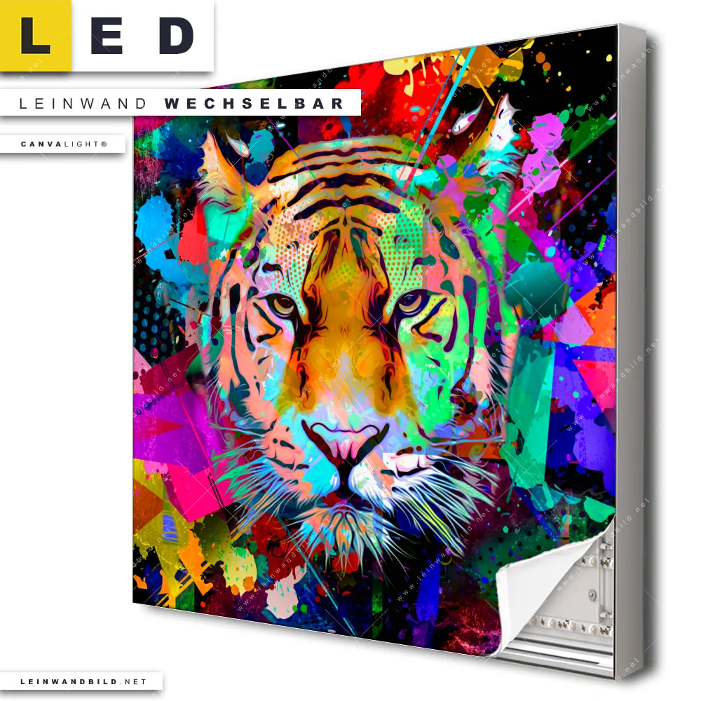 Du bist auf der Suche nach einem Tierwelt LED Leinwandbild im Quadratischen Format? Begriffe wie Raubkatze, Tiger, Afrika, Dschungel, Farbe, Farbspritzer, Farbexplosion, Porträt haben Dich auf der Suche nach Deinem neuen XXL LED Wandbild mit wechselbarer Leinwand inspiriert? Farben wie Bunt, Schwarz dürfen auf Deinem neuen Leinwand-LED-Bild nicht fehlen und Leuchtbilder im Abstrakt, Modern Art, Pop Art, Street Art Stil passen perfekt zu Deinem Einrichtungsstil?
