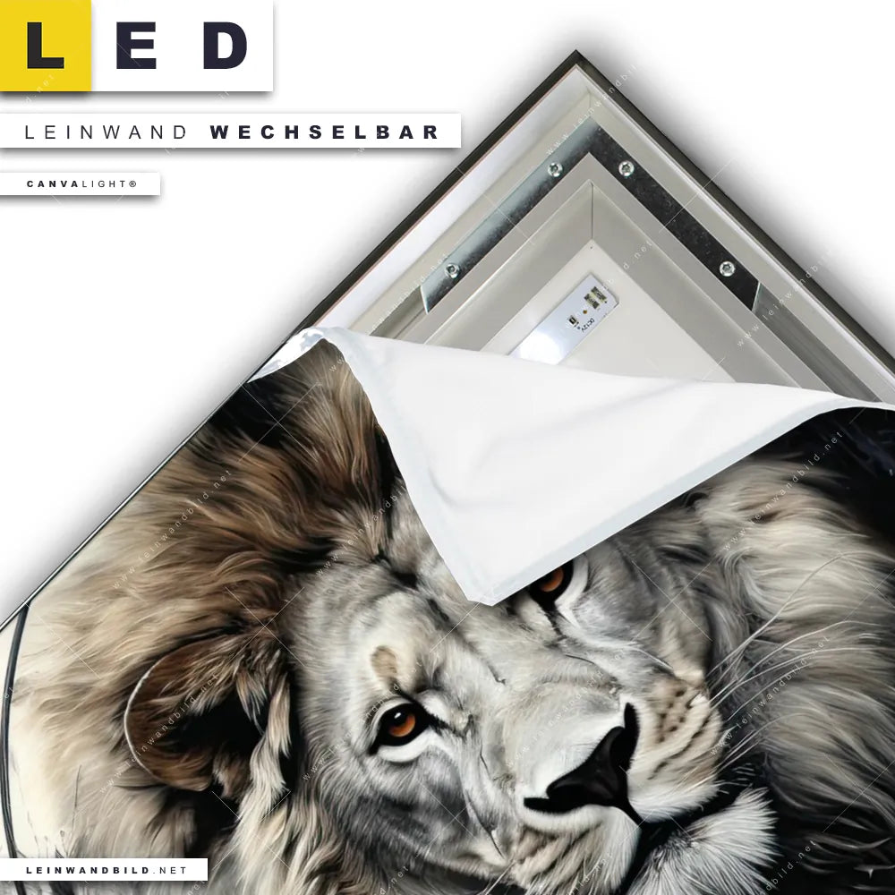 Du konfigurierst Dein individuelles LED Leinwandbild Canvalight® TEX | Porträt eines Löwen | Quadrat und wir produzieren es NEU für Dich. Unsere Tierwelt LED Bilder mit wechselbarer Textil-Leinwand sind KEINE Lagerware. Du bist Dir unsicher, welches Motiv oder Format das richtige für dein individuelles Canvalight® Leuchtbild ist, dann helfen wir dir gerne weiter und beraten dich!