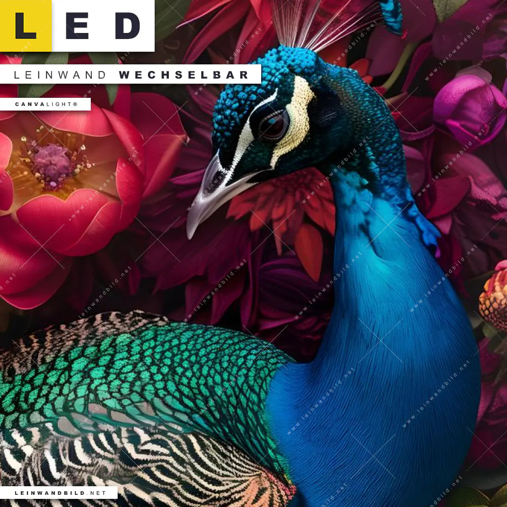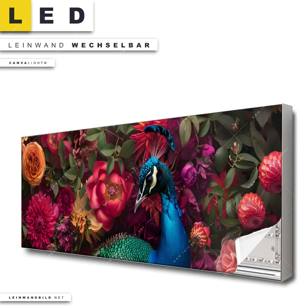LED Leinwandbild Canvalight® TEX | Prachtvoller Pfau und Blüten | Panorama