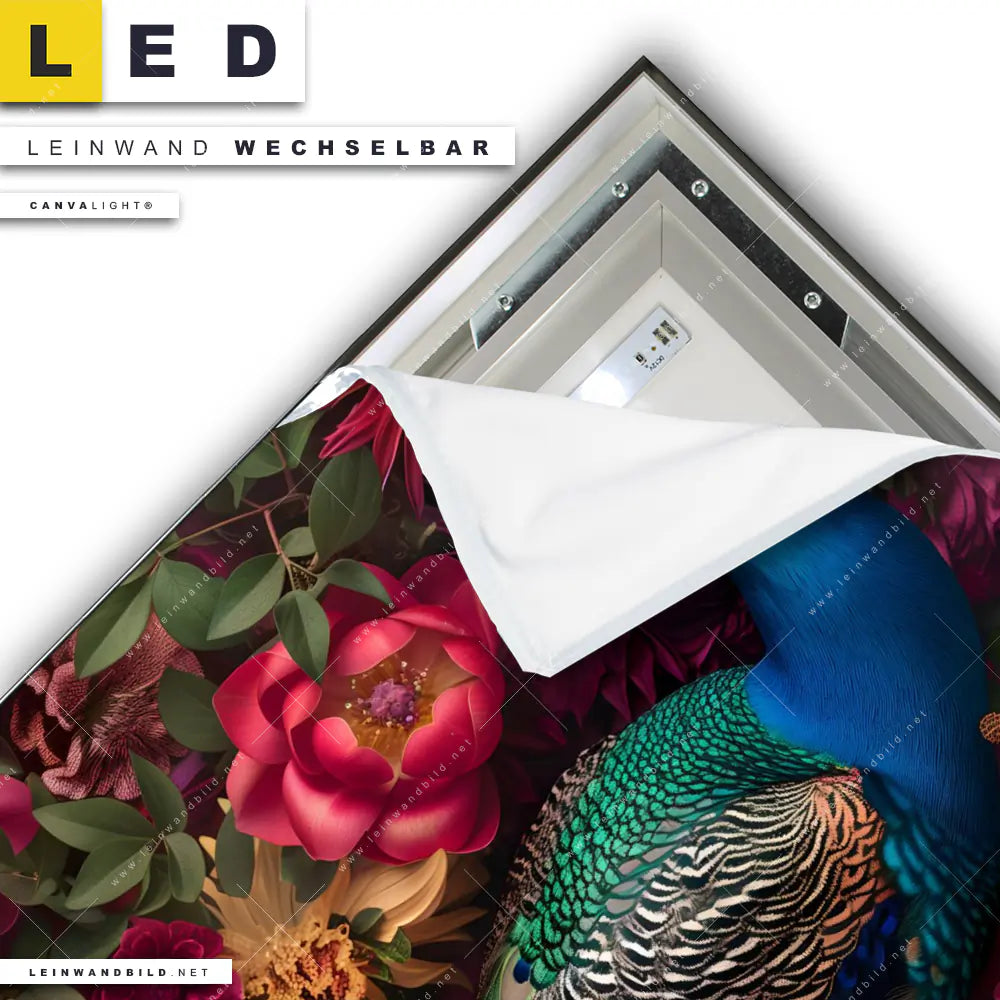 Du konfigurierst Dein individuelles LED Leinwandbild Canvalight® TEX | Prachtvoller Pfau und Blüten | Quadrat und wir produzieren es NEU für Dich. Unsere Tierwelt, Blumen - Botanik LED Bilder mit wechselbarer Textil-Leinwand sind KEINE Lagerware. Du bist Dir unsicher, welches Motiv oder Format das richtige für dein individuelles Canvalight® Leuchtbild ist, dann helfen wir dir gerne weiter und beraten dich!