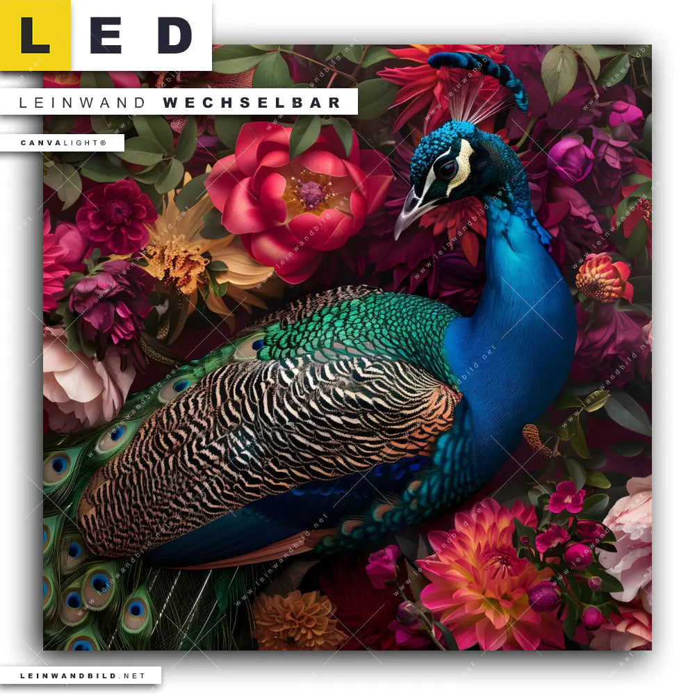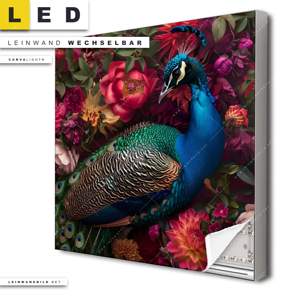 LED Leinwandbild Canvalight® TEX | Prachtvoller Pfau und Blüten | Quadrat