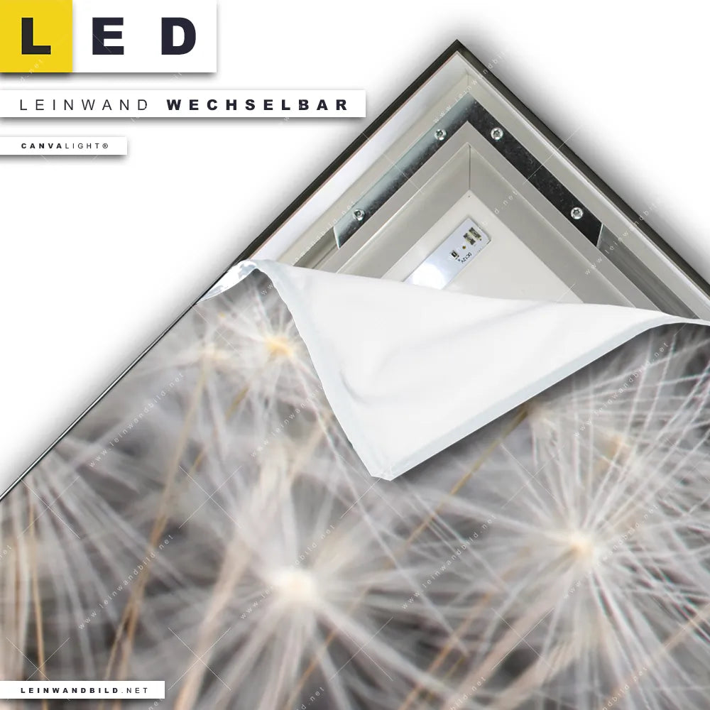 Du konfigurierst Dein individuelles LED Leinwandbild Canvalight® TEX | Pusteblume No. 10 | Panorama und wir produzieren es NEU für Dich. Unsere Blumen - Botanik LED Bilder mit wechselbarer Textil-Leinwand sind KEINE Lagerware. Du bist Dir unsicher, welches Motiv oder Format das richtige für dein individuelles Canvalight® Leuchtbild ist, dann helfen wir dir gerne weiter und beraten dich!