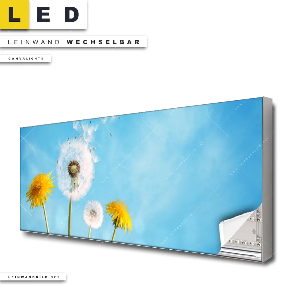 Du bist auf der Suche nach einem Blumen - Botanik LED Leinwandbild im Panorama-Format? Begriffe wie Blume, Botanik, Pflanze, Natur, Nahaufnahme, Pusteblume, Dandelion, Löwenzahn haben Dich auf der Suche nach Deinem neuen XXL LED Wandbild mit wechselbarer Leinwand inspiriert? Farben wie Weiss, Blau, Gelb , Hellgrün, Grün, Türkis dürfen auf Deinem neuen extra breiten Leinwand-LED-Bild nicht fehlen und Leuchtbilder im Floral, Natürlich - Realistisch Stil passen perfekt zu Deinem Einrichtungsstil?