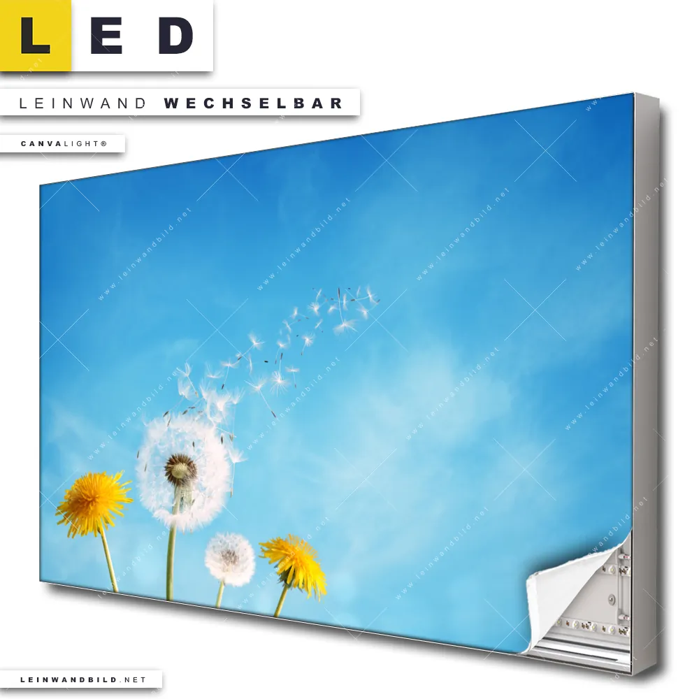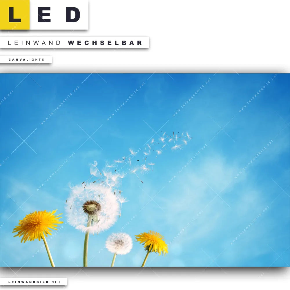 Du bist auf der Suche nach einem Blumen - Botanik LED Leinwandbild im Querformat? Begriffe wie Blume, Botanik, Pflanze, Natur, Nahaufnahme, Pusteblume, Dandelion, Löwenzahn haben Dich auf der Suche nach Deinem neuen XXL LED Wandbild mit wechselbarer Leinwand inspiriert? Farben wie Weiss, Blau, Gelb , Hellgrün, Grün, Türkis dürfen auf Deinem neuen breiten Leinwand-LED-Bild nicht fehlen und Leuchtbilder im Floral, Natürlich - Realistisch Stil passen perfekt zu Deinem Einrichtungsstil?