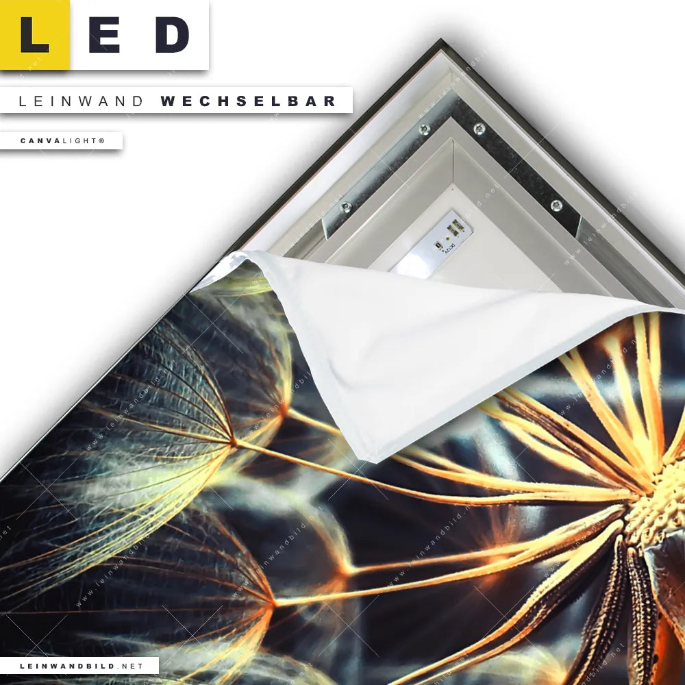 Du konfigurierst Dein individuelles LED Leinwandbild Canvalight® TEX | Pusteblume No. 9 | Quadrat und wir produzieren es NEU für Dich. Unsere Blumen - Botanik LED Bilder mit wechselbarer Textil-Leinwand sind KEINE Lagerware. Du bist Dir unsicher, welches Motiv oder Format das richtige für dein individuelles Canvalight® Leuchtbild ist, dann helfen wir dir gerne weiter und beraten dich!