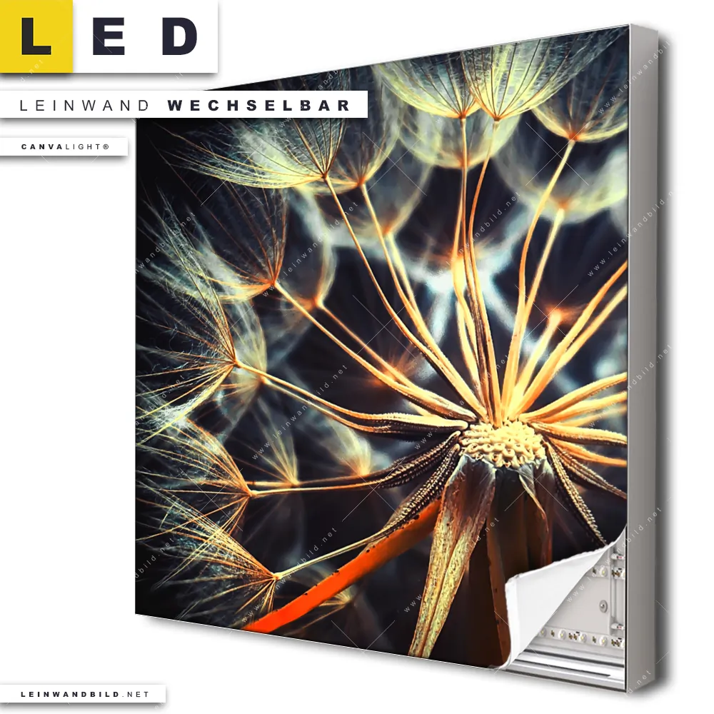 Du bist auf der Suche nach einem Blumen - Botanik LED Leinwandbild im Quadratischen Format? Begriffe wie Blume, Botanik, Pflanze, Natur, Nahaufnahme, Pusteblume, Dandelion, Löwenzahn haben Dich auf der Suche nach Deinem neuen XXL LED Wandbild mit wechselbarer Leinwand inspiriert? Farben wie Schwarz, Beige, Blau, Orange, Ocker dürfen auf Deinem neuen Leinwand-LED-Bild nicht fehlen und Leuchtbilder im Floral, Natürlich - Realistisch Stil passen perfekt zu Deinem Einrichtungsstil?
