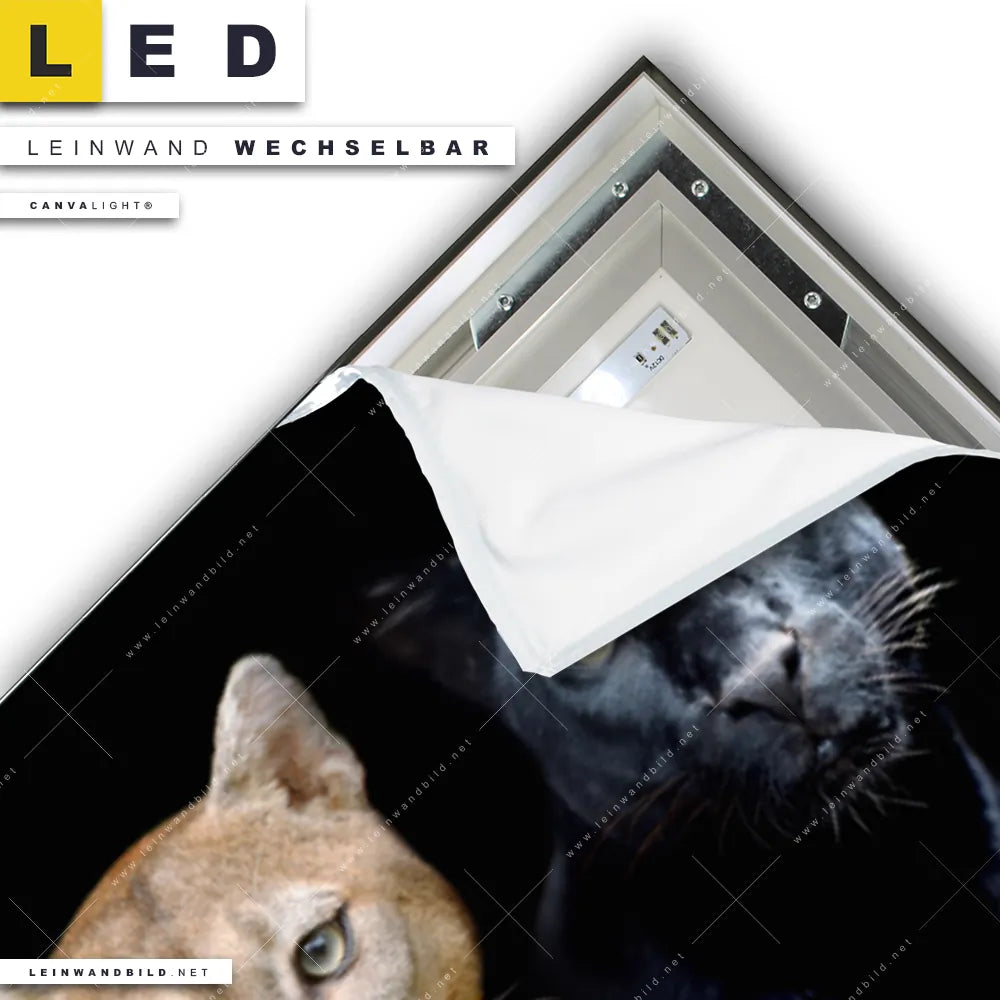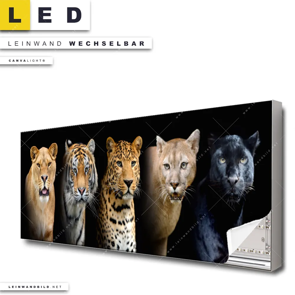Du konfigurierst Dein individuelles LED Leinwandbild Canvalight® TEX | Raubkatzen | Panorama und wir produzieren es NEU für Dich. Unsere Tierwelt LED Bilder mit wechselbarer Textil-Leinwand sind KEINE Lagerware. Du bist Dir unsicher, welches Motiv oder Format das richtige für dein individuelles Canvalight® Leuchtbild ist, dann helfen wir dir gerne weiter und beraten dich!