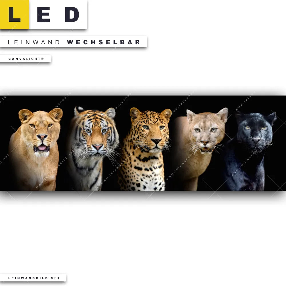 Dann sollte das LED Leinwandbild Canvalight® TEX | Raubkatzen | Panorama den Weg zu Dir finden. Das stufenlos dimmbare Leinwandbild Löwe, Tiger, Leopard & Schwarzer Panther im steckerfertigen Leuchtrahmen mit Fernbedienung und optionaler Farbtemperatursteuerung fügt sich als Eye-Catcher harmonisch in jedes Arzt - Praxis, Bar - Gastronomie, Büro - Kanzlei, Wohnzimmer - Schlafzimmer Raumkonzept ein.