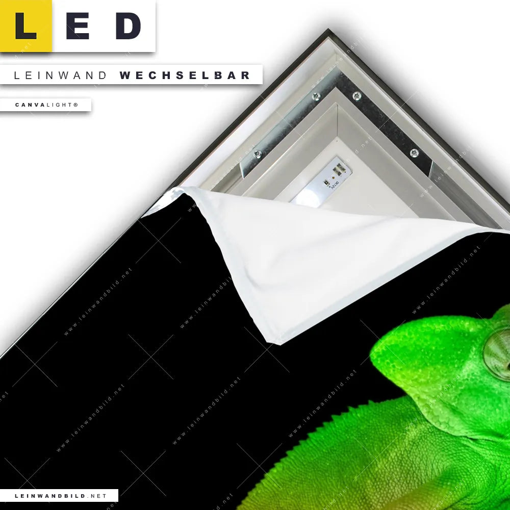 Du konfigurierst Dein individuelles LED Leinwandbild Canvalight® TEX | Regenbogen Chamäleon | Hochformat und wir produzieren es NEU für Dich. Unsere Tierwelt LED Bilder mit wechselbarer Textil-Leinwand sind KEINE Lagerware. Du bist Dir unsicher, welches Motiv oder Format das richtige für dein individuelles Canvalight® Leuchtbild ist, dann helfen wir dir gerne weiter und beraten dich!