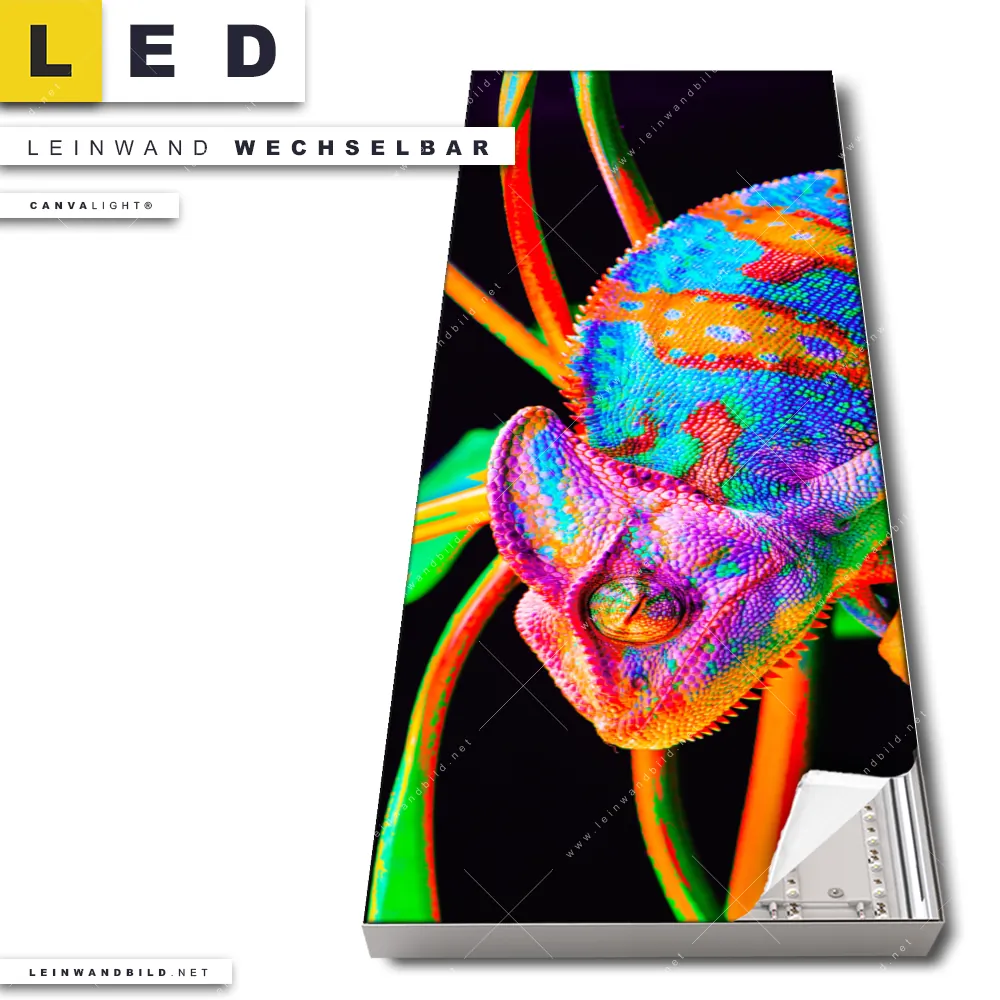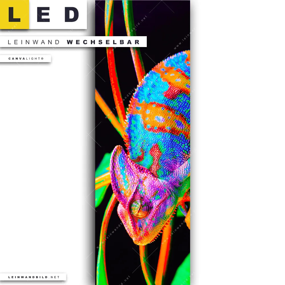Du bist auf der Suche nach einem Tierwelt LED Leinwandbild im Schmalen Format? Begriffe wie Tiere, Farbe, bunt, Chamäleon, Regenbogen, Pop Art haben Dich auf der Suche nach Deinem neuen XXL LED Wandbild mit wechselbarer Leinwand inspiriert? Farben wie Bunt dürfen auf Deinem neuen Leinwand-LED-Bild im Panorama-Hochformat nicht fehlen und Leuchtbilder im Mixed Media, Modern Art, Pop Art Stil passen perfekt zu Deinem Einrichtungsstil?