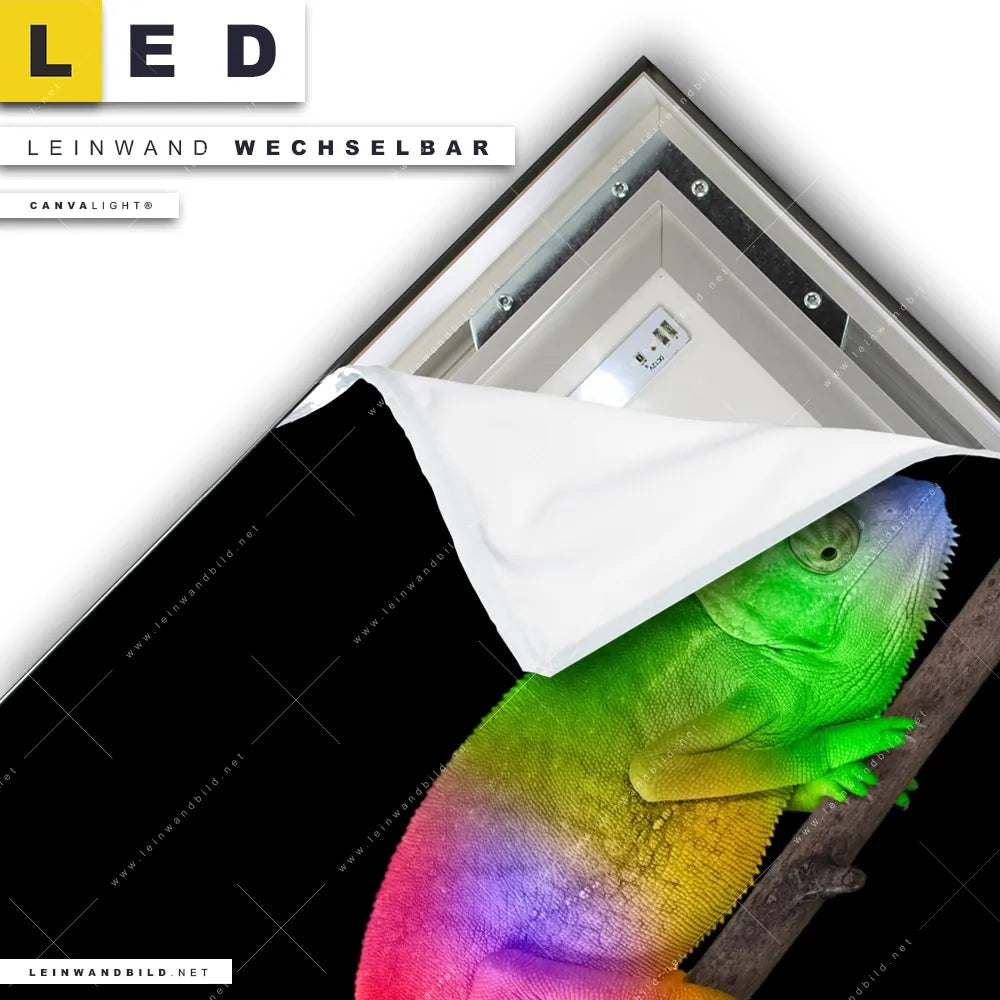 Du konfigurierst Dein individuelles LED Leinwandbild Canvalight® TEX | Regenbogen Chamäleon | Quadrat und wir produzieren es NEU für Dich. Unsere Tierwelt LED Bilder mit wechselbarer Textil-Leinwand sind KEINE Lagerware. Du bist Dir unsicher, welches Motiv oder Format das richtige für dein individuelles Canvalight® Leuchtbild ist, dann helfen wir dir gerne weiter und beraten dich!