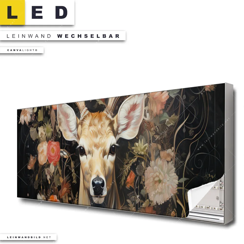 Du bist auf der Suche nach einem Tierwelt, Blumen - Botanik LED Leinwandbild im Panorama-Format? Begriffe wie Rotwild, Wald, Hirsch, Blüten, Geweih haben Dich auf der Suche nach Deinem neuen XXL LED Wandbild mit wechselbarer Leinwand inspiriert? Farben wie Schwarz, Beige, Braun, Weiss, Rot dürfen auf Deinem neuen extra breiten Leinwand-LED-Bild nicht fehlen und Leuchtbilder im Abstrakt, Floral, Retro - Vintage Stil passen perfekt zu Deinem Einrichtungsstil?