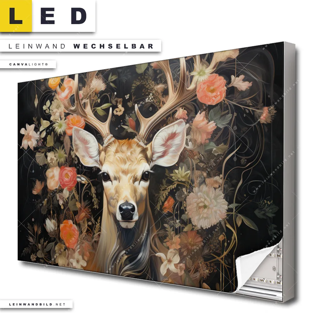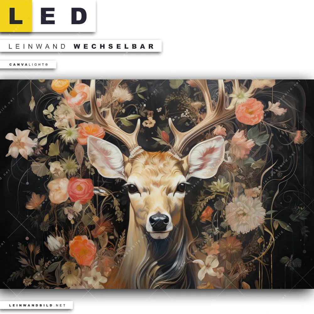 Du bist auf der Suche nach einem Tierwelt, Blumen - Botanik LED Leinwandbild im Querformat? Begriffe wie Rotwild, Wald, Hirsch, Blüten, Geweih haben Dich auf der Suche nach Deinem neuen XXL LED Wandbild mit wechselbarer Leinwand inspiriert? Farben wie Schwarz, Beige, Braun, Weiss, Rot dürfen auf Deinem neuen breiten Leinwand-LED-Bild nicht fehlen und Leuchtbilder im Abstrakt, Floral, Retro - Vintage Stil passen perfekt zu Deinem Einrichtungsstil?