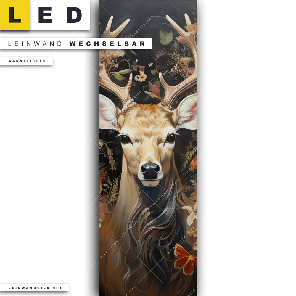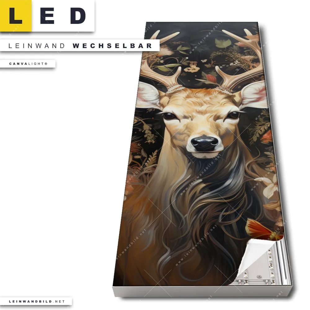 Du bist auf der Suche nach einem Tierwelt, Blumen - Botanik LED Leinwandbild im Schmalen Format? Begriffe wie Rotwild, Wald, Hirsch, Blüten, Geweih haben Dich auf der Suche nach Deinem neuen XXL LED Wandbild mit wechselbarer Leinwand inspiriert? Farben wie Schwarz, Beige, Braun, Weiss, Rot dürfen auf Deinem neuen Leinwand-LED-Bild im Panorama-Hochformat nicht fehlen und Leuchtbilder im Abstrakt, Floral, Retro - Vintage Stil passen perfekt zu Deinem Einrichtungsstil?