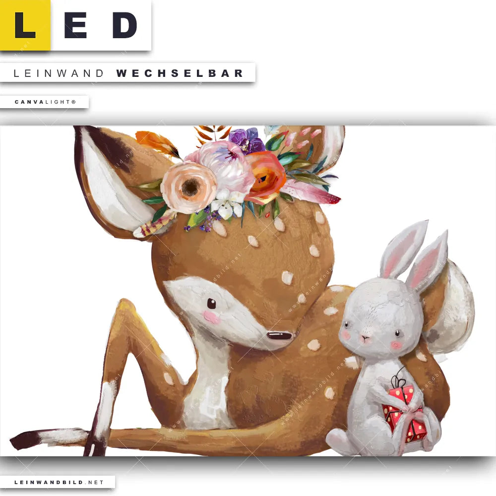 Du bist auf der Suche nach einem Tierwelt LED Leinwandbild im Querformat? Begriffe wie Kinder, Reh, Hase, Tiere, Blumen, Aquarell, Kunst, Freunde haben Dich auf der Suche nach Deinem neuen XXL LED Wandbild mit wechselbarer Leinwand inspiriert? Farben wie Braun, Weiss, Grün, Rot, Lila, Rosa dürfen auf Deinem neuen breiten Leinwand-LED-Bild nicht fehlen und Leuchtbilder im Modern Art Stil passen perfekt zu Deinem Einrichtungsstil?