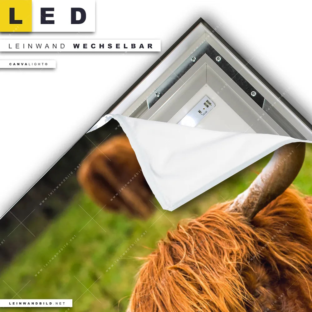 Du konfigurierst Dein individuelles LED Leinwandbild Canvalight® TEX | Rind in den schottischen Highlands | Hochformat und wir produzieren es NEU für Dich. Unsere Tierwelt LED Bilder mit wechselbarer Textil-Leinwand sind KEINE Lagerware. Du bist Dir unsicher, welches Motiv oder Format das richtige für dein individuelles Canvalight® Leuchtbild ist, dann helfen wir dir gerne weiter und beraten dich!
