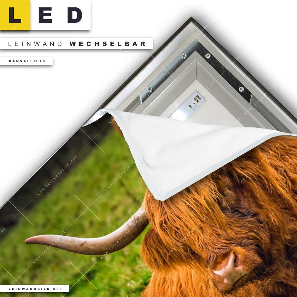 Du konfigurierst Dein individuelles LED Leinwandbild Canvalight® TEX | Rind in den schottischen Highlands | Quadrat und wir produzieren es NEU für Dich. Unsere Tierwelt LED Bilder mit wechselbarer Textil-Leinwand sind KEINE Lagerware. Du bist Dir unsicher, welches Motiv oder Format das richtige für dein individuelles Canvalight® Leuchtbild ist, dann helfen wir dir gerne weiter und beraten dich!