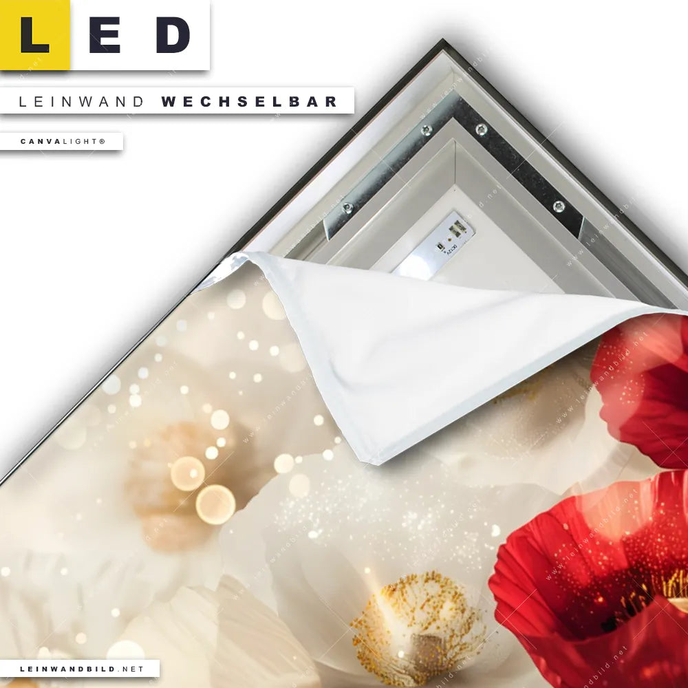 Du konfigurierst Dein individuelles LED Leinwandbild Canvalight® TEX | Rote und weiße Mohnblumen | Querformat und wir produzieren es NEU für Dich. Unsere Blumen - Botanik LED Bilder mit wechselbarer Textil-Leinwand sind KEINE Lagerware. Du bist Dir unsicher, welches Motiv oder Format das richtige für dein individuelles Canvalight® Leuchtbild ist, dann helfen wir dir gerne weiter und beraten dich!